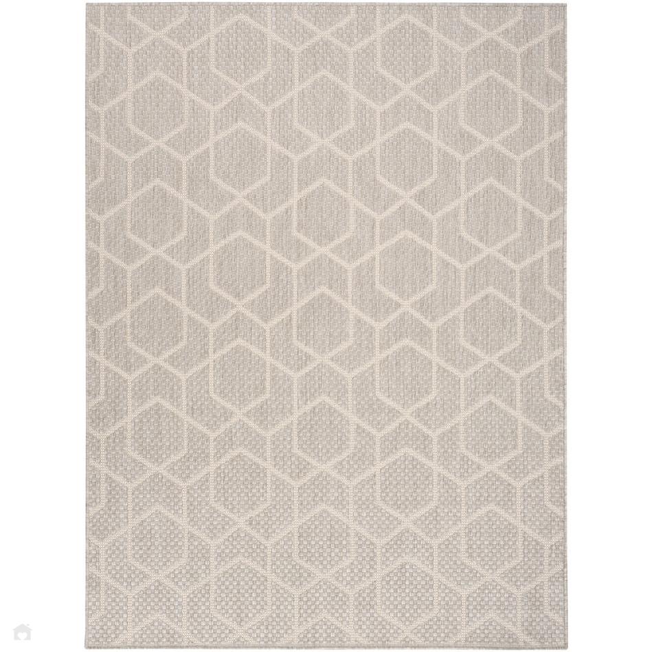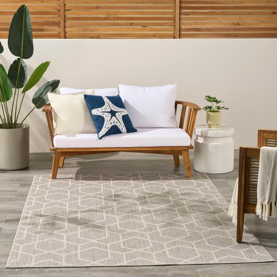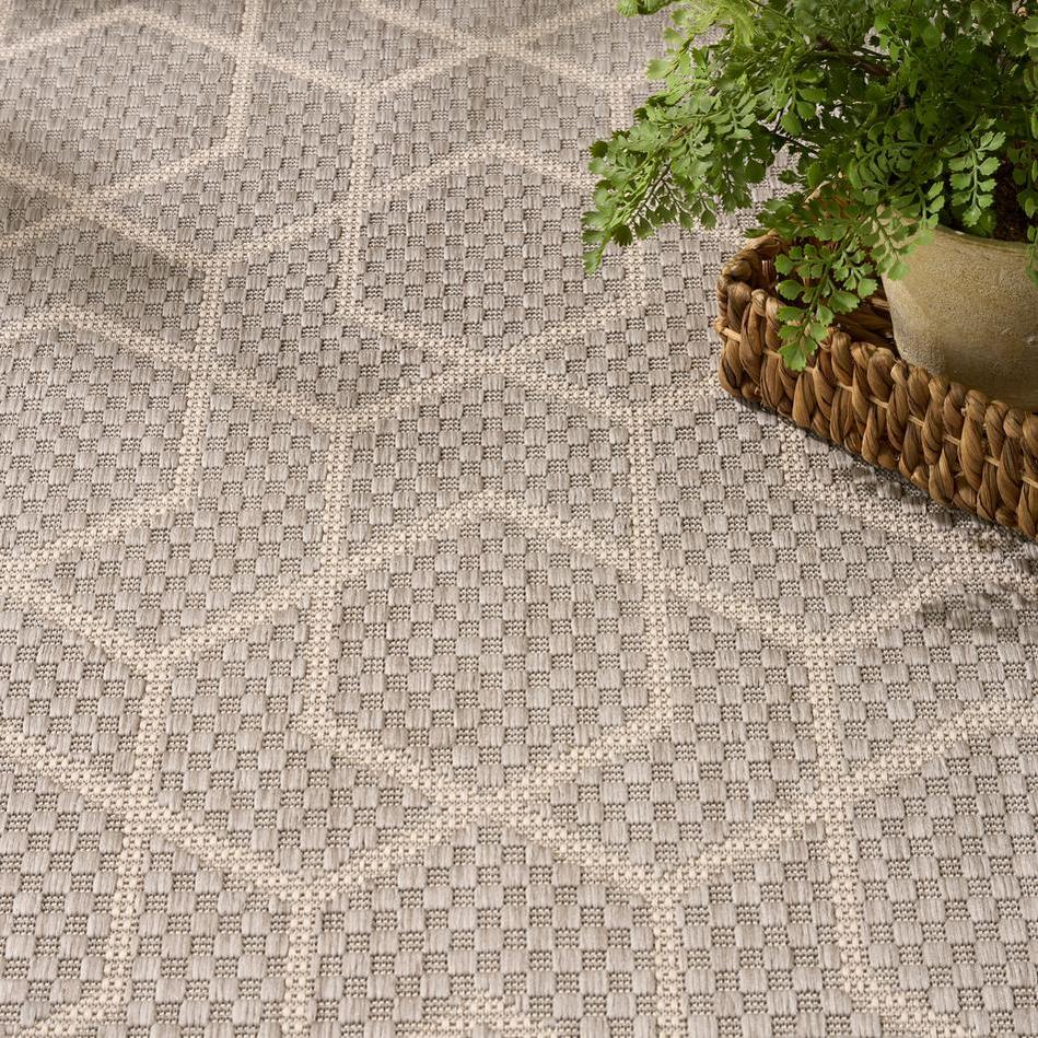 Sleek and modern, this grey geometric outdoor rug from the Horizon Collection offers a contemporary take on classic design. The eye-catching pattern effortlessly complements a variety of settings from urban balconies to cozy living rooms while adding depth and visual appeal. This flatweave rug is made from a blend of polyester and polypropylene with a subtle high-low pile and tonal variations.