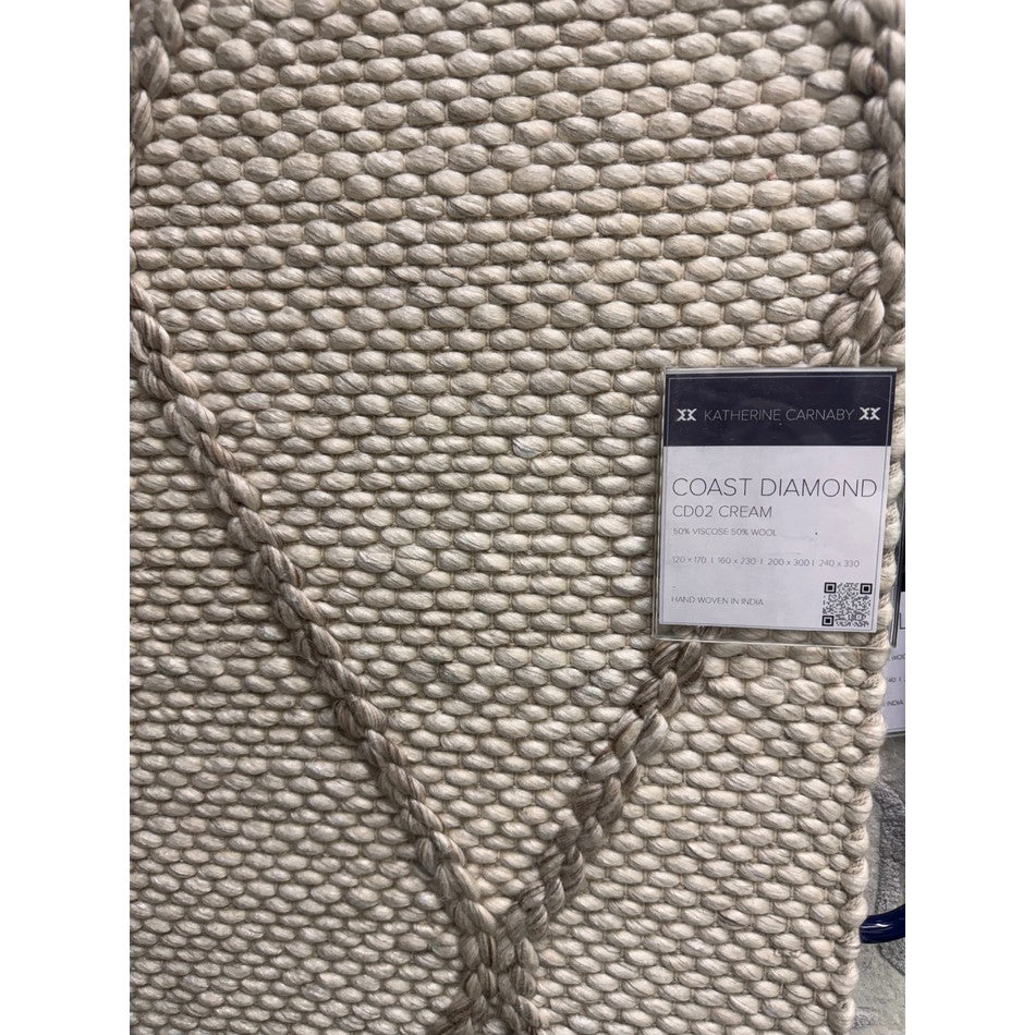 The Katherine Carnaby Coast CD02 Cream Rug presents a refined cream and beige palette elevated by a geometric diamond design. Hand-woven in India from a 50% wool, 50% viscose blend, it delivers both durability and a subtle sheen, offering a soft yet textured surface underfoot. Its flatweave construction makes it a versatile, low-profile choice for modern living rooms, bedrooms, and open-plan spaces. With its blend of natural wool tones, elegant sheen, and understated geometric pattern, this rug captures timeless style with a contemporary edge.