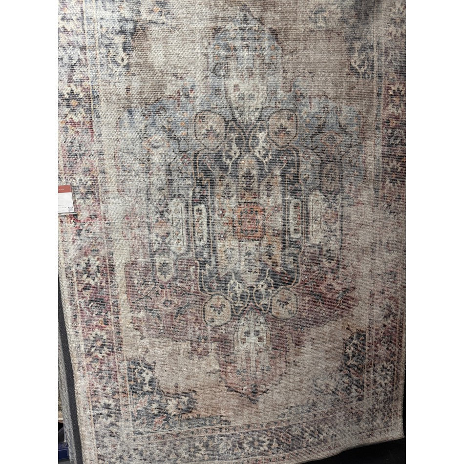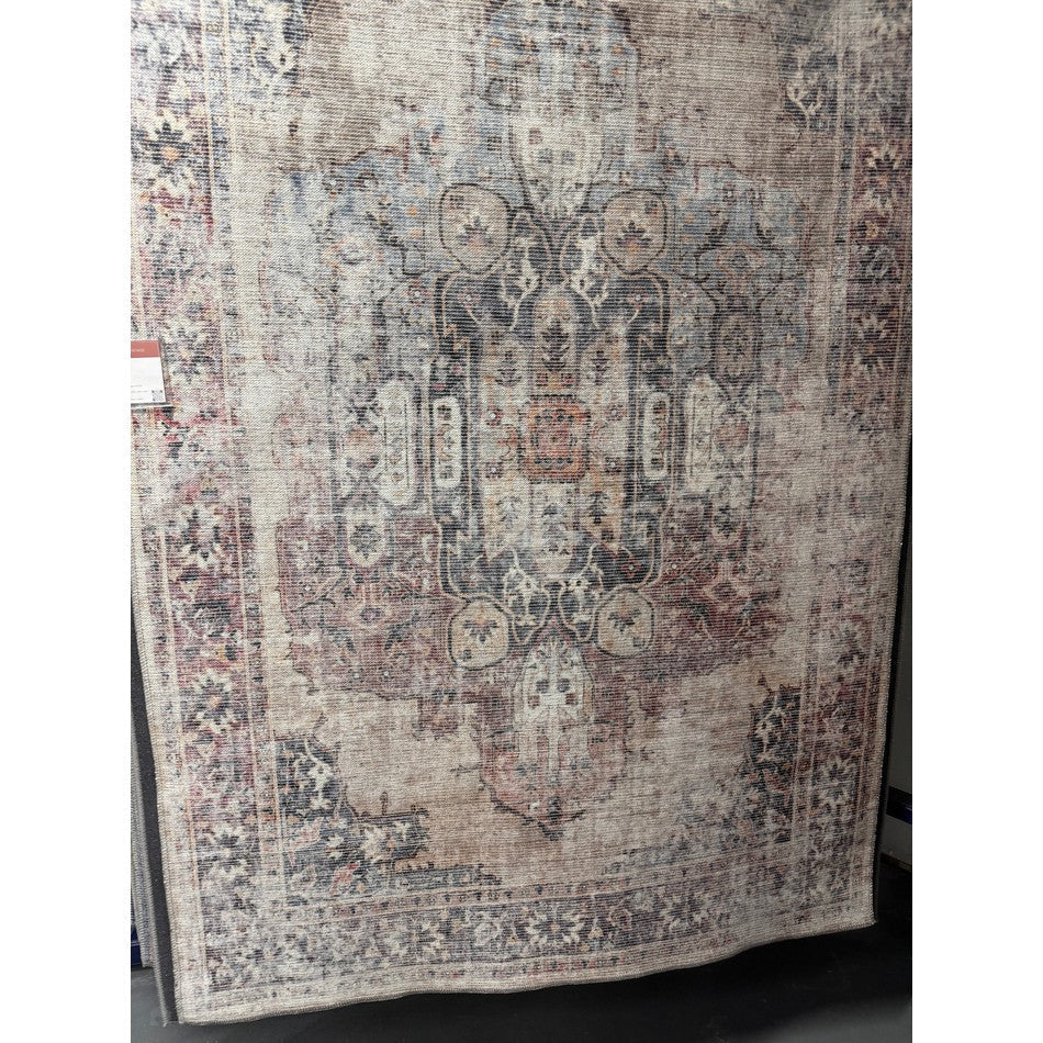 The Kaya Lila design features a traditional Persian medallion layout, elegantly distressed for a faded, well-loved look. The composition unfolds from a central ornamental medallion outward through intricate corner motifs and a floral border, creating symmetry and visual depth. The tonal layering of beige, pink, red, and blue evokes the charm of handwoven vintage rugs while maintaining a versatile, modern feel that complements both classic and contemporary interiors.