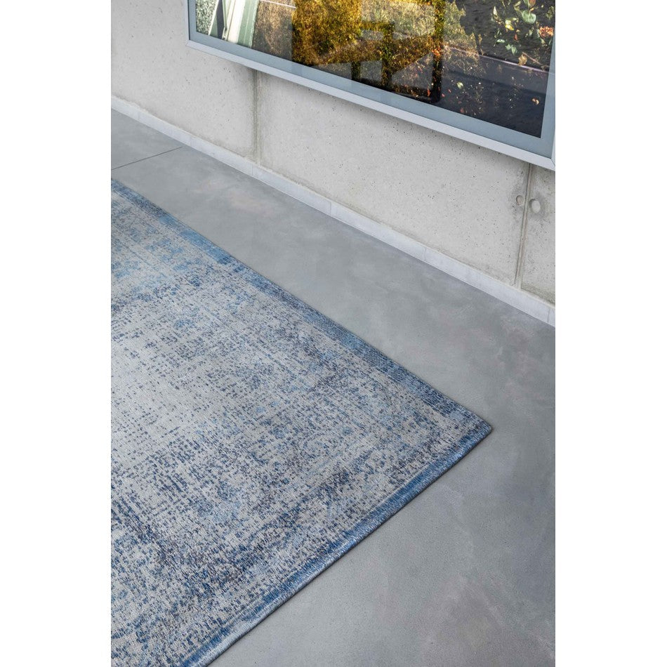 The Louis De Poortere Fading World Medallion 9065 Grey Jeans Rug showcases a refined blend of Jeans Blue, Soft Grey, Faded Indigo, and Ivory White, forming a beautifully distressed composition inspired by timeworn Persian artistry. The central medallion and bordered detailing offer an elegant vintage feel, while the faded wash of blue tones brings a refreshing, modern edge.