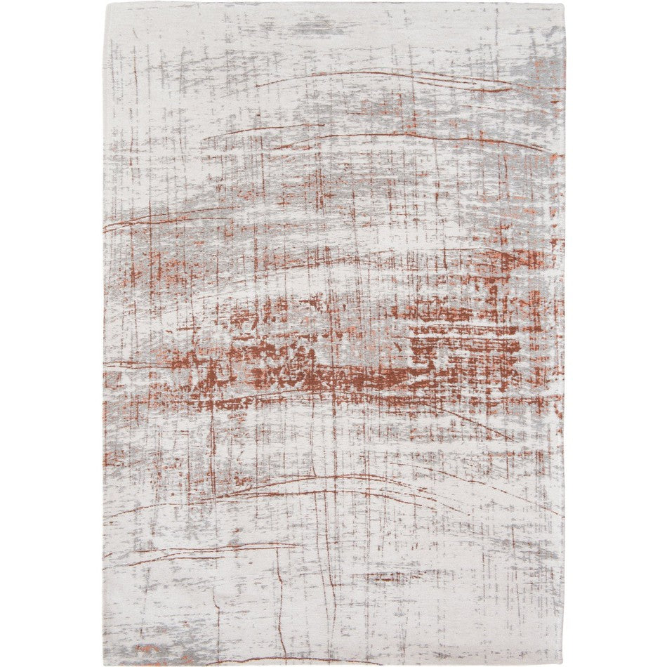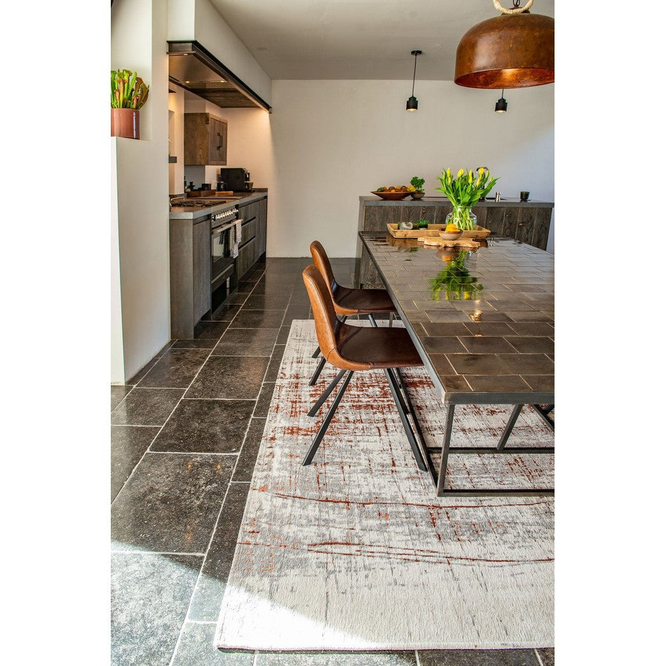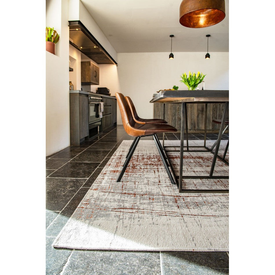 The Louis De Poortere Mad Men Griff 8956 Copperfield Rug is a modern flatweave masterpiece featuring a 0.3 cm low-profile pile and a 100% polyester (20% recycled) composition for durability and sustainability. Its warm copper, soft cream, pale grey, and charcoal grey palette delivers a contemporary yet timeless feel, enhanced by a distressed abstract pattern reminiscent of late-sixties action painting. Machine-woven on Jacquard Wilton looms, this rug is hand-finished with reinforced corners and features a built-in anti-slip latex backing. Fully machine washable, recyclable, and eco-conscious, it is perfect for dining rooms, living rooms, or modern open-plan interiors, adding both texture and a pop of colour to your space.