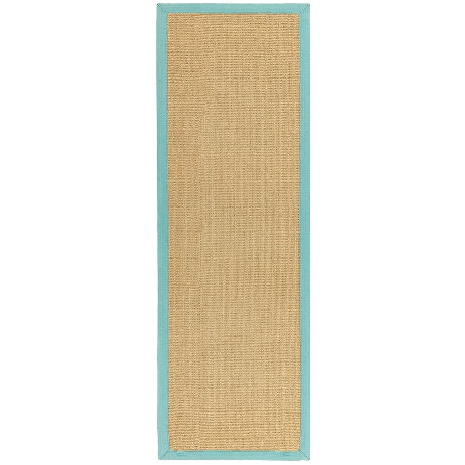The Sisal Plain Border Natural/Aqua Blue Runner from the Sisal collection combines earthy natural texture with a refined contemporary edge. Expertly crafted from 100% natural sisal fibres, it features a ribbed flatweave design with a distinctive handwoven look and tactile texture that highlights the beauty of raw plant fibres. The surface has a firm, slightly coarse feel typical of sisal, making it durable, resilient, and ideal for high-traffic areas. Finished with a cotton border for definition and an anti-slip backing for added stability, this rug is both practical and stylish—perfect for hallways, kitchens, and modern living spaces.