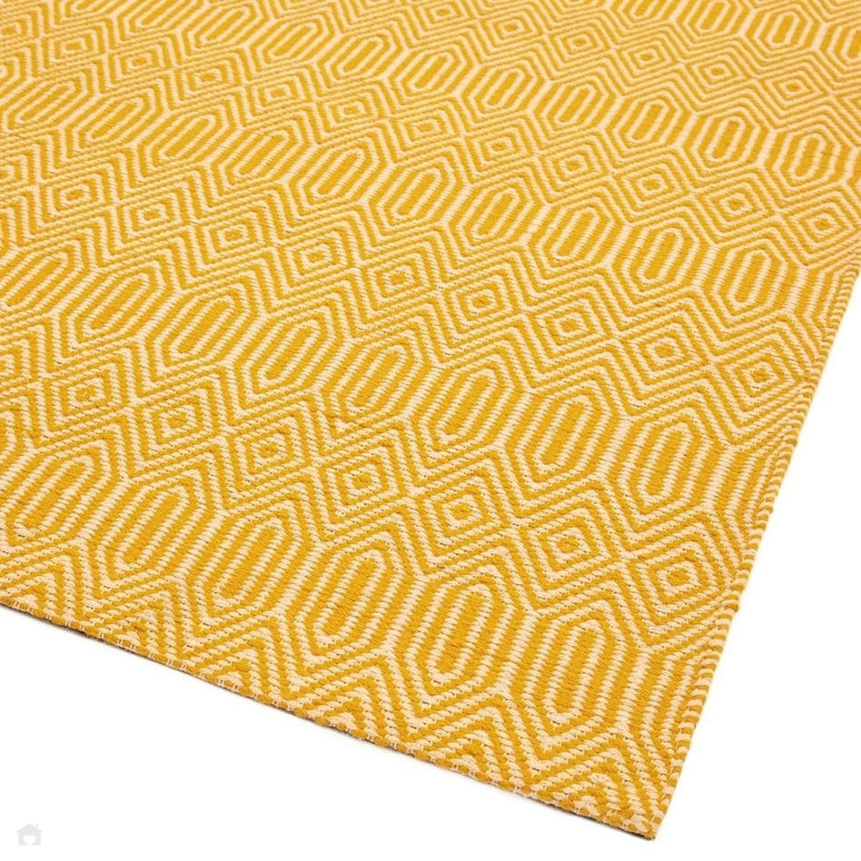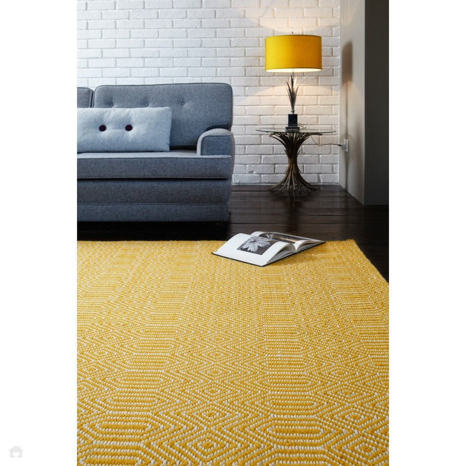 Its repeating geometric diamond pattern is woven using mustard yellow and ivory yarns, creating a lively yet refined contrast. The soft wool fibres and flatweave texture ensure a smooth, resilient surface — perfect for living rooms, dining spaces, and relaxed modern interiors. Sloan draws inspiration from traditional hand-woven textiles, featuring rhythmic geometric motifs that echo ethnic and tribal design heritage redefined in modern geometric simplicity through clean lines and balanced symmetry for minimalist, Scandinavian, or urban interiors. Sloan brings effortless sophistication to contemporary living spaces.