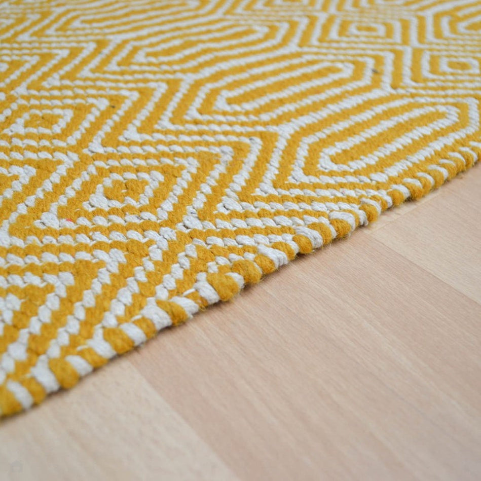 Its repeating geometric diamond pattern is woven using mustard yellow and ivory yarns, creating a lively yet refined contrast. The soft wool fibres and flatweave texture ensure a smooth, resilient surface — perfect for living rooms, dining spaces, and relaxed modern interiors. Sloan draws inspiration from traditional hand-woven textiles, featuring rhythmic geometric motifs that echo ethnic and tribal design heritage redefined in modern geometric simplicity through clean lines and balanced symmetry for minimalist, Scandinavian, or urban interiors. Sloan brings effortless sophistication to contemporary living spaces.