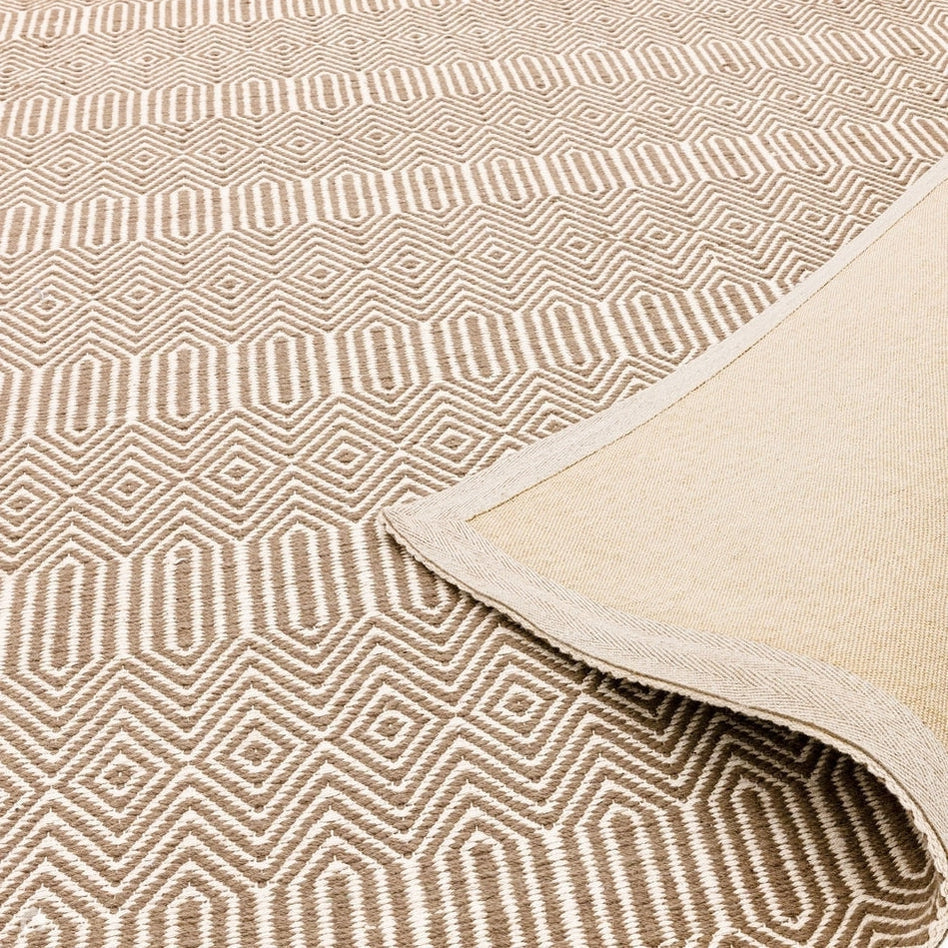 Its surface showcases a precise geometric diamond pattern, formed through contrasting woven sections of taupe and white fibres. This creates a subtle duo-tone optical effect with natural texture and movement. The flatweave texture makes it highly durable and ideal for busy areas such as living rooms, dining spaces, and hallways, while remaining soft underfoot. Sloan draws inspiration from traditional hand-woven textiles, featuring rhythmic geometric motifs that echo ethnic and tribal design heritage redefined in modern geometric simplicity through clean lines and balanced symmetry for minimalist, Scandinavian, or urban interiors. Sloan brings effortless sophistication to contemporary living spaces.