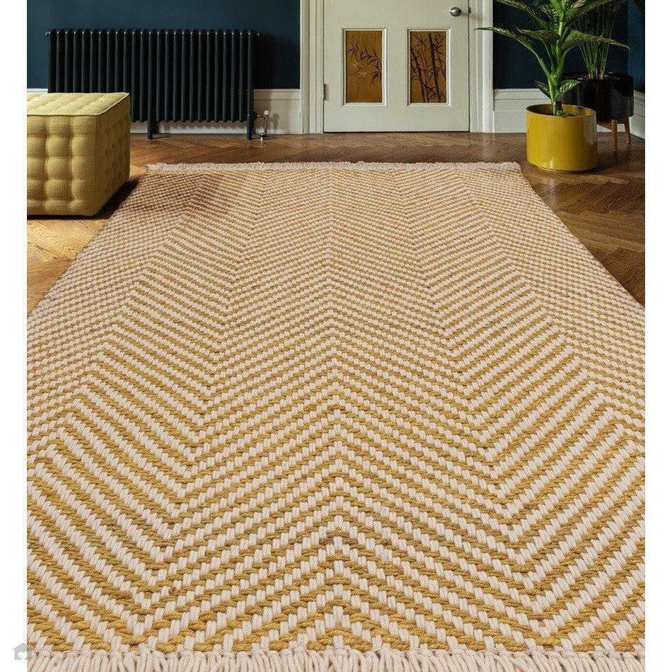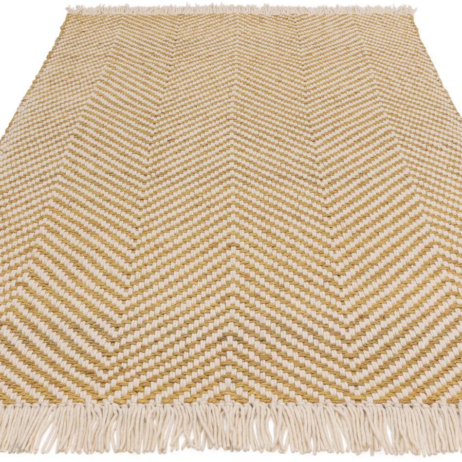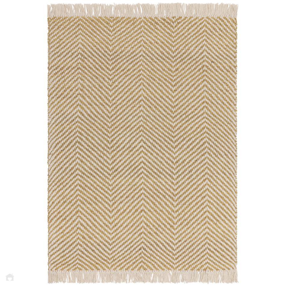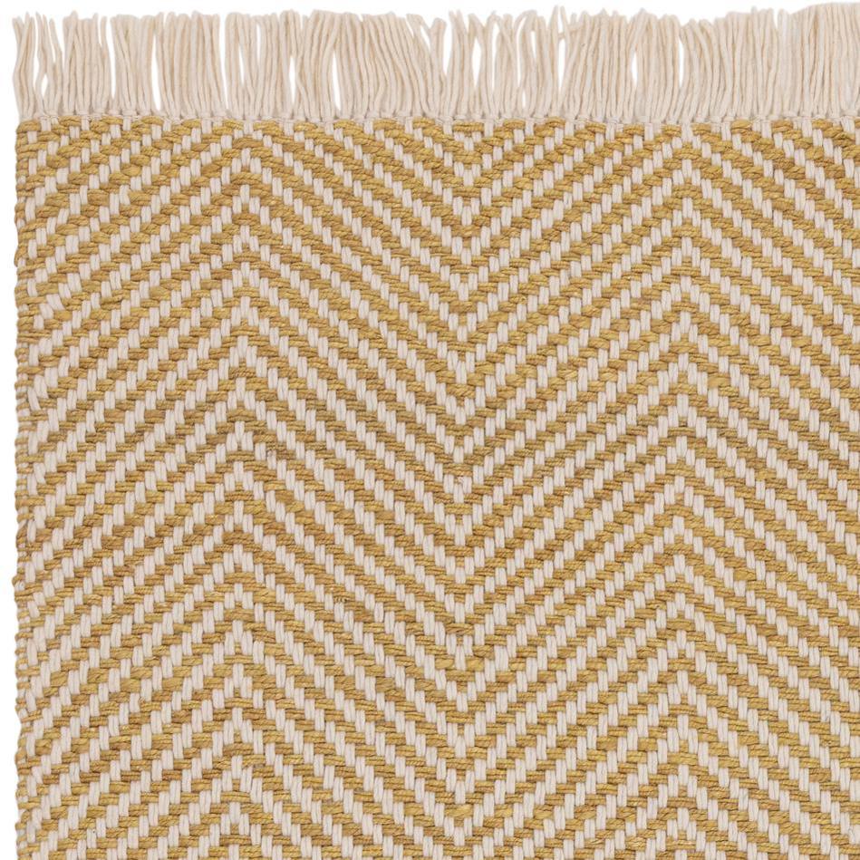 The Vigo Ochre/Cream Rug combines Ochre Yellow, Natural Cream, and Warm Taupe in a striking chevron-inspired weave that delivers both style and warmth to your home. The handwoven jute and cotton mix construction creates a tactile, durable texture that is ideal for living rooms, bedrooms, and hallways, while the ivory fringe detail enhances its bohemian appeal. Its flatweave structure ensures easy maintenance, making it a practical choice for modern living.