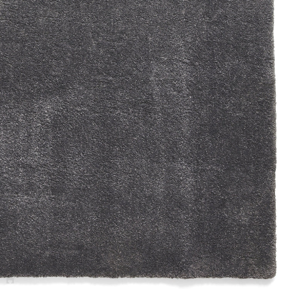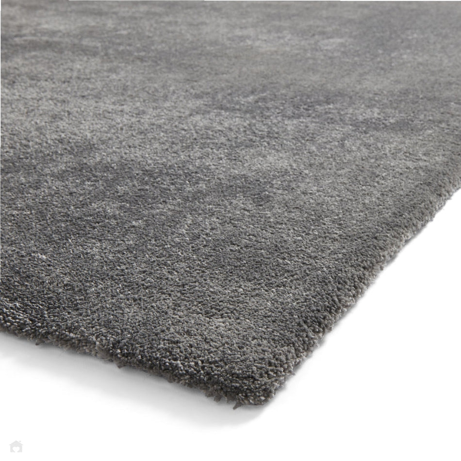 The densely woven surface reflects light subtly, creating tonal shifts between deep graphite, mid-charcoal, and pale ash-grey highlights. This natural variation enhances the rug’s sense of depth and texture, giving it a rich, luxurious finish.