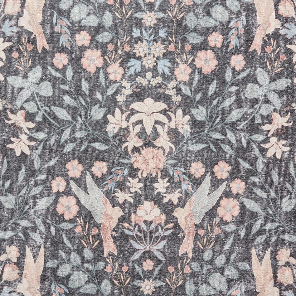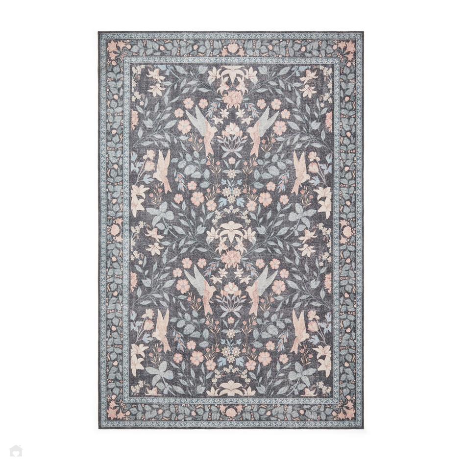 The Washable Versailles H1423 Deep Dark Charcoal Blue/Steel Blue/Soft Blush Pink/Pale Peach Rug blends timeless floral artistry with the convenience of modern washable design. Inspired by traditional botanical tapestries, this piece features an intricate pattern of birds and blossoms woven across a deep, moody base. Crafted from digitally printed polyester, it delivers exceptional clarity, soft texture, and practical durability — perfect for homes seeking style without compromise.