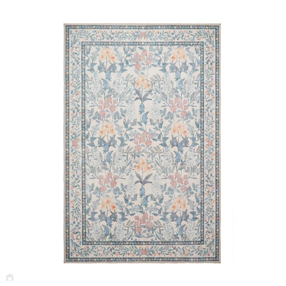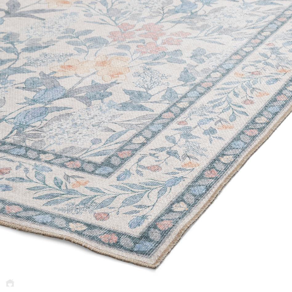 The Washable Versailles H1425 Warm Beige/Muted Sky Blue Rug showcases an elegant floral design enriched with tones of Warm Beige, Muted Sky Blue, Soft Powder Blue, Blush Pink, Peach Coral, Cream Ivory, Dusty Sage Green, and Faded Slate Blue. Crafted from digitally printed polyester, it features a smooth 0.2 cm flatweave washable pile with an anti-slip backing for secure placement on hard floors. Its lightweight, foldable structure allows for effortless maintenance and easy machine washing, making it ideal for living rooms, bedrooms, dining areas, or kitchens. The refined floral pattern brings a touch of sophistication and charm to any setting, pairing beautifully with neutral furnishings, pastel accents, or natural wood décor.