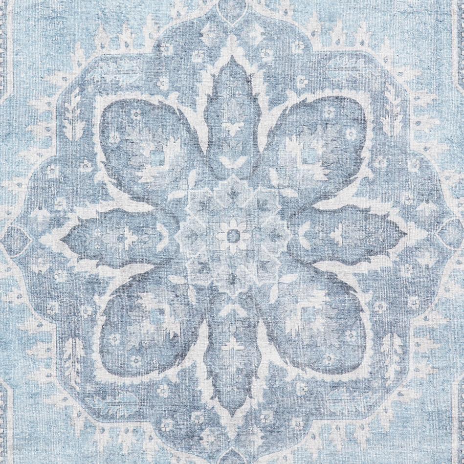 Crafted with a low-profile 0.2 cm flatweave pile, foldable construction, and integrated anti-slip backing, this rug is ideal for high-traffic rooms, pet-friendly households, and busy family living. The medallion design and floral border are lightly distressed for an authentic aged look, while the tonal layering of soft blues and ivory creates a serene, balanced effect that complements both modern and classic interiors.