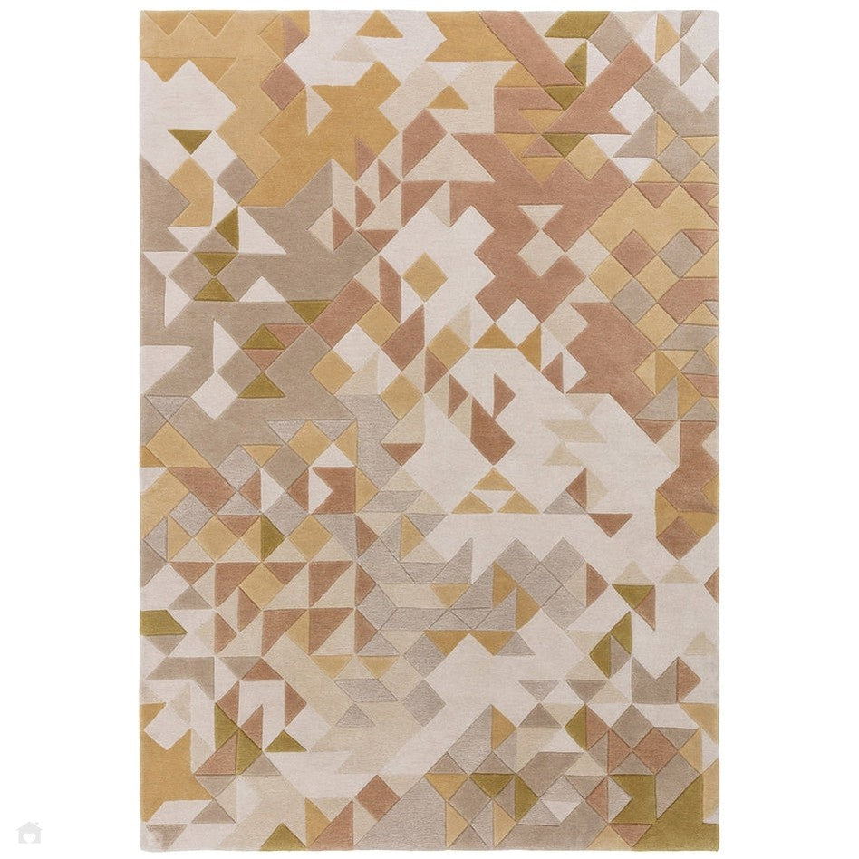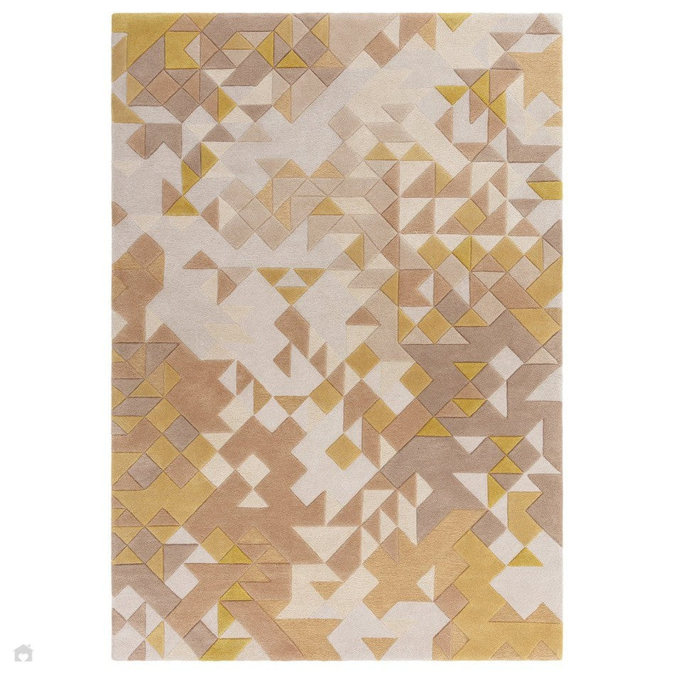 The Enigma Modern Geometric 3D Hand-Carved Wool & Viscose Rug in Gold, Beige & Brown blends Soft Cream, Warm Beige, Muted Brown, Golden Yellow, and Ochre tones within a high-density, hand-carved structure, creating a striking geometric design that radiates elegance and depth. Its 9mm hi-low carved pile and 4.6kg per m² heavyweight density deliver a richly textured, sculptural surface, while the wool-viscose blend ensures durability, softness, and a subtle lustrous sheen.