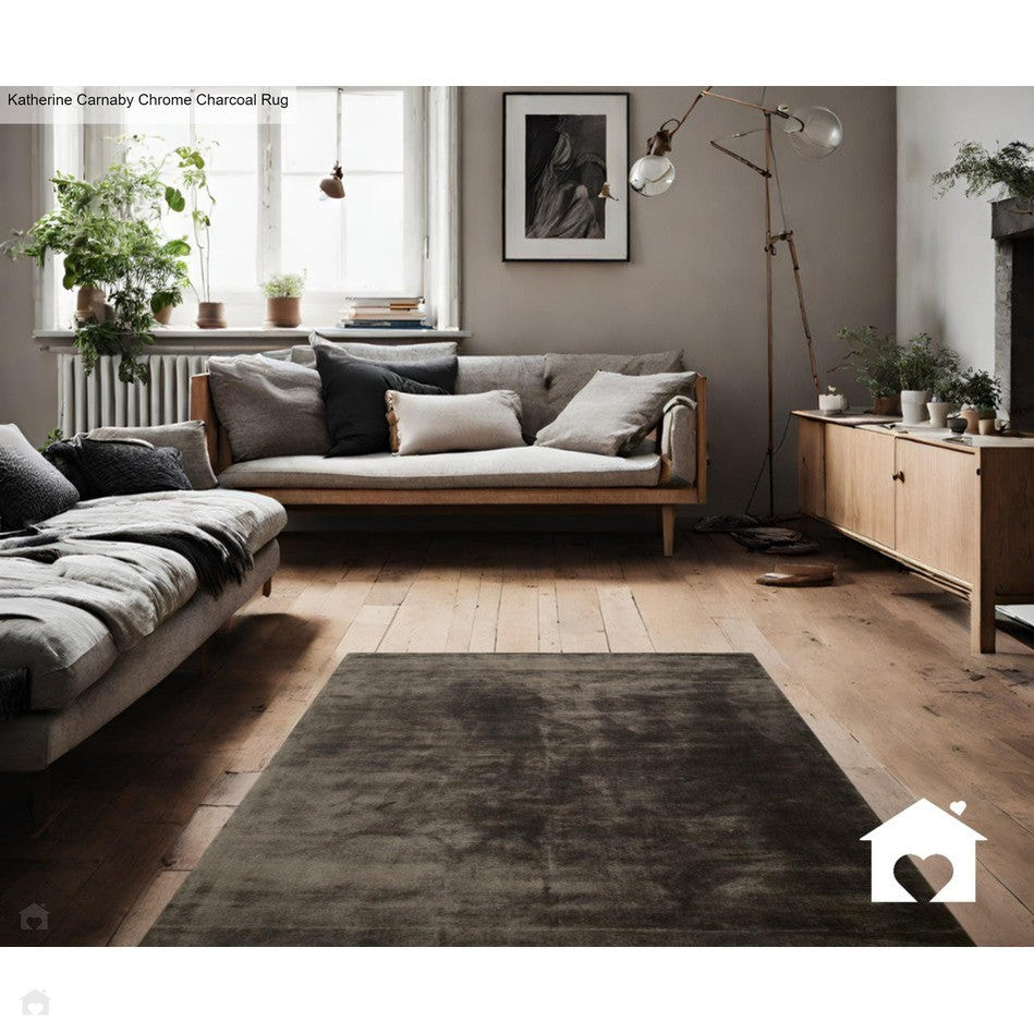 The Katherine Carnaby Chrome Charcoal Rug embodies sleek sophistication through its expertly balanced tones of Charcoal Grey, Deep Graphite, and Pewter Silver, enriched by Ash Grey and Smoky Slate highlights. Hand-woven from 100% viscose, it features a dense, high-density pile with a silky-smooth, light-reflective finish that transforms beautifully under light. This luxurious design complements modern living spaces, monochrome interiors, and refined open-plan rooms, delivering depth, warmth, and the signature radiance of the Katherine Carnaby Chrome range.