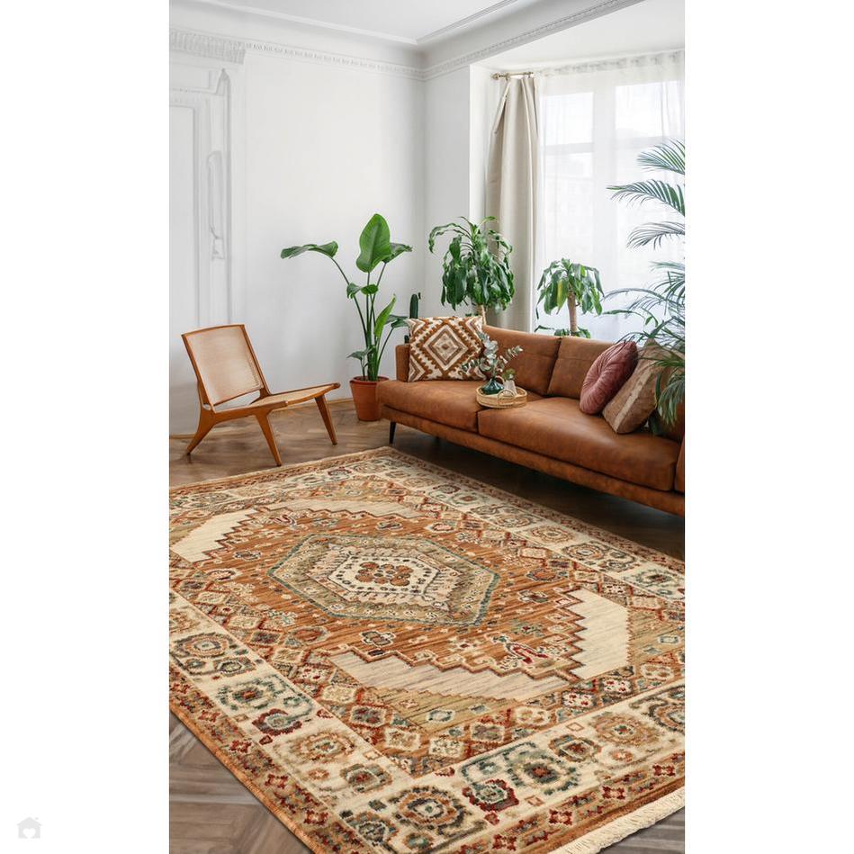 The Nomad Traditional Terracotta Rug showcases a geometric medallion pattern inspired by Persian and Middle Eastern design heritage, enriched by a sophisticated blend of Terracotta, Ivory, Soft Beige, Rust Red, Sage Green, Olive Green, Teal Blue, and Charcoal Grey.