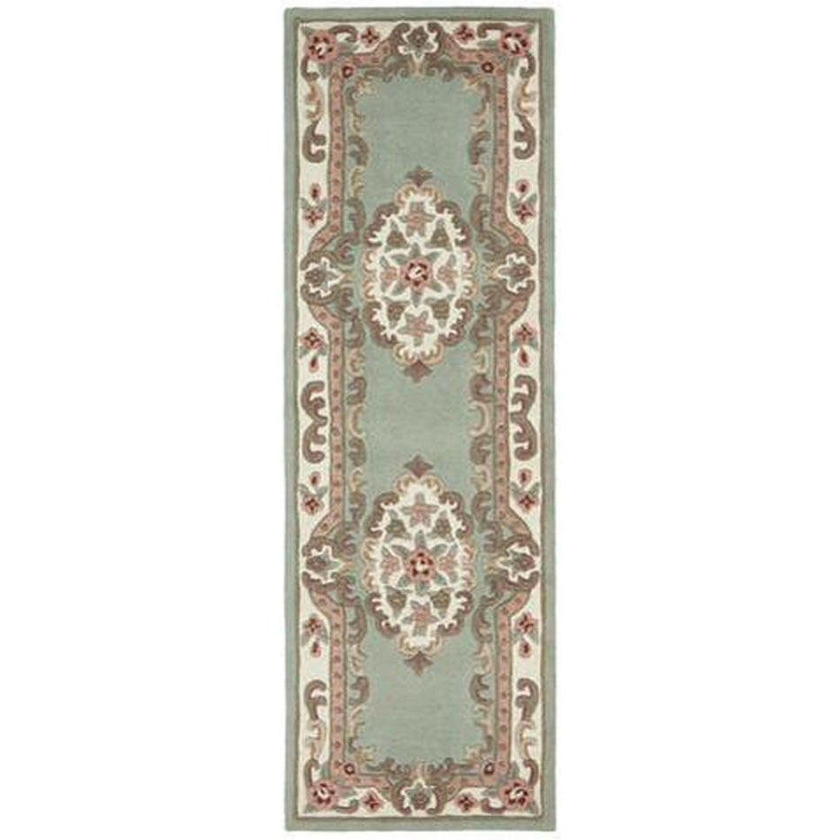 The Shensi Traditional Floral Aubusson Green Rug combines Soft Sage Green, Ivory, Rose Pink, Deep Burgundy Red, Olive Green, and Taupe Brown in a richly detailed composition that celebrates traditional craftsmanship. Its carved hi-low wool pile (2.5cm height, 2300 GR/M²) enhances the floral medallion and scrolling border with texture and dimension. Perfect for living rooms, dining spaces, and bedrooms, this rug brings elegance and lasting comfort, making it a timeless addition to both classic and modern interiors.