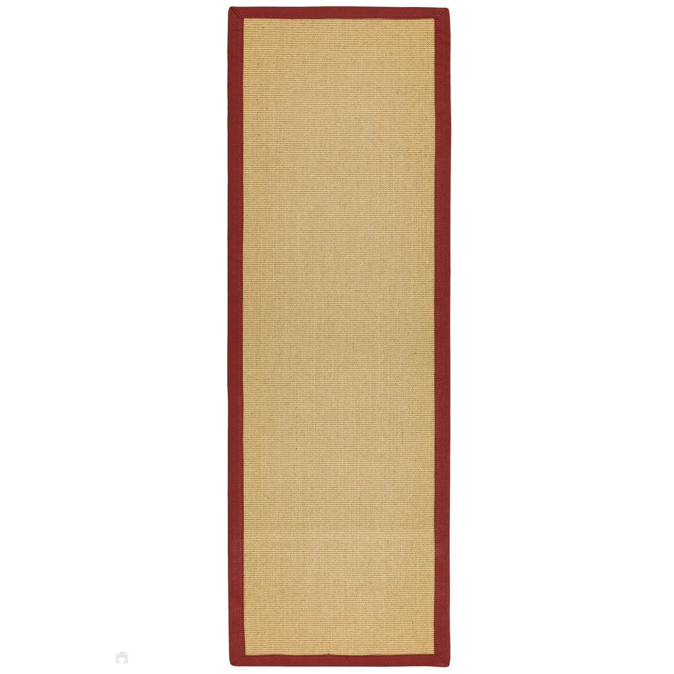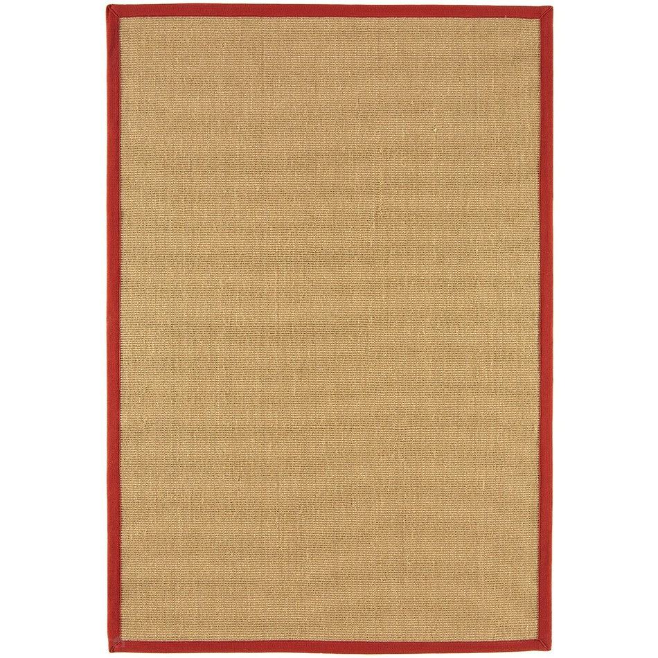The Sisal Plain Border Natural/Red Rug from the Sisal collection combines earthy natural texture with a refined contemporary edge. Expertly crafted from 100% natural sisal fibres, it features a ribbed flatweave design with a distinctive handwoven look and tactile texture that highlights the beauty of raw plant fibres. The surface has a firm, slightly coarse feel typical of sisal, making it durable, resilient, and ideal for high-traffic areas. Finished with a cotton border for definition and an anti-slip backing for added stability, this rug is both practical and stylish—perfect for hallways, kitchens, and modern living spaces.