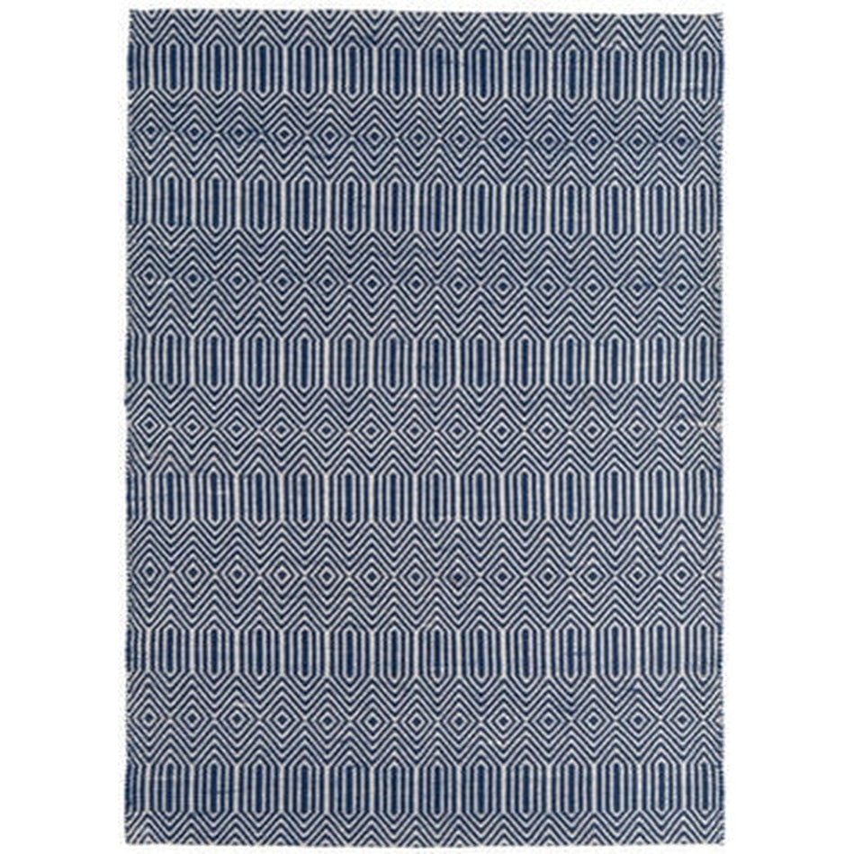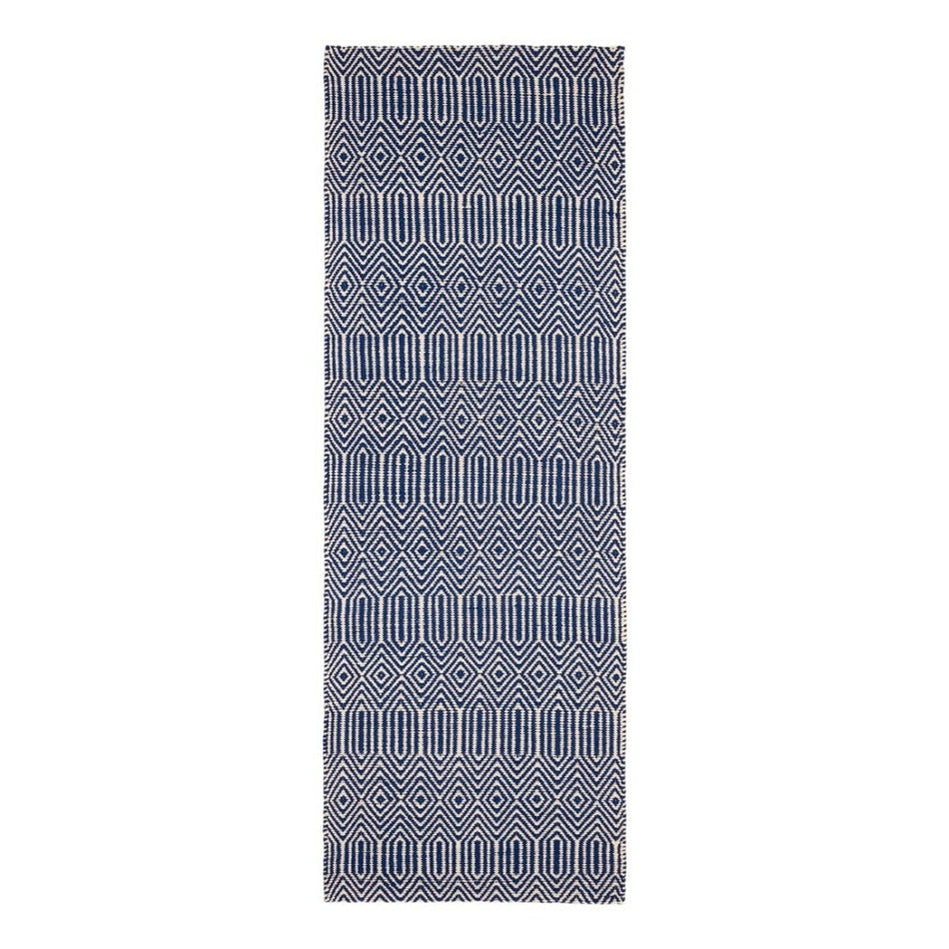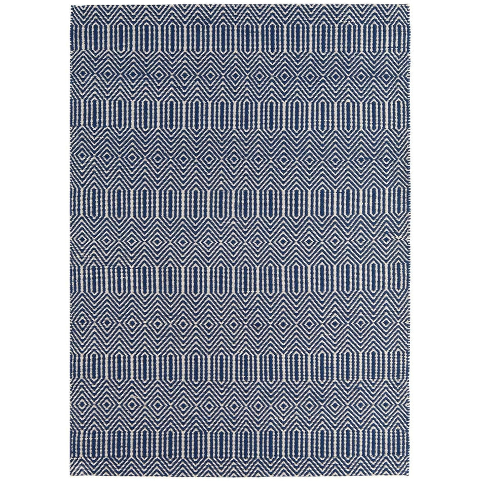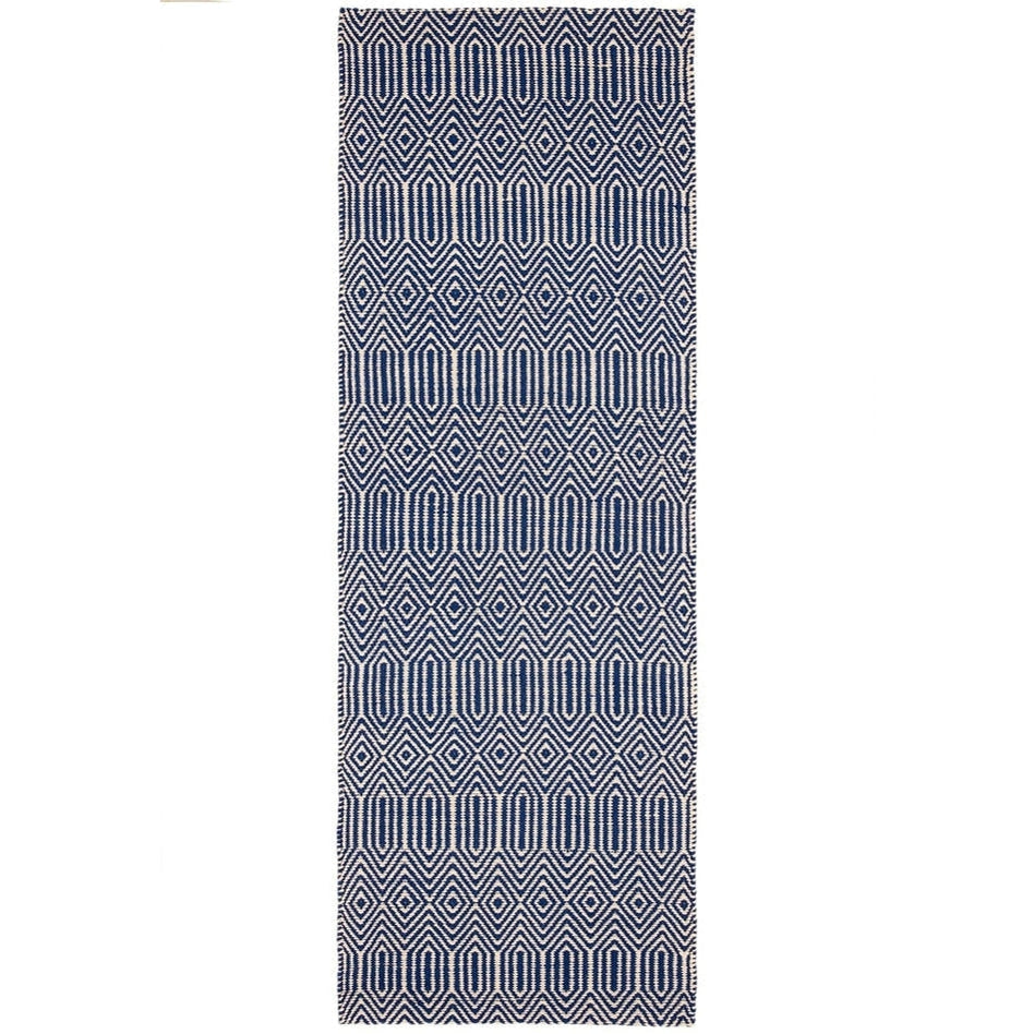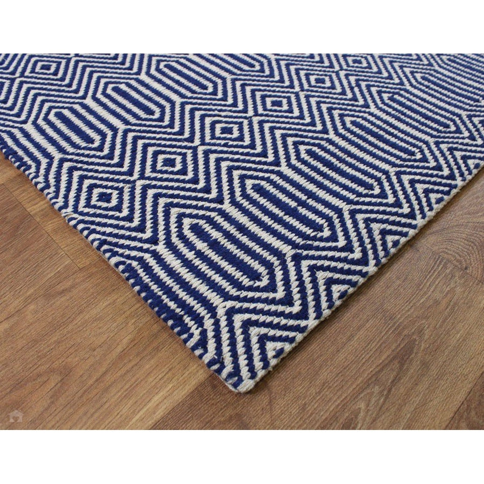 Its geometric diamond pattern is rendered in deep navy blue and soft ivory, creating a striking visual rhythm that feels modern yet grounded. The smooth wool fibres lend softness underfoot, while the cotton base provides stability and structure, making this rug a stylish choice for living rooms, hallways, and open-plan spaces. Sloan draws inspiration from traditional hand-woven textiles, featuring rhythmic geometric motifs that echo ethnic and tribal design heritage redefined in modern geometric simplicity through clean lines and balanced symmetry for minimalist, Scandinavian, or urban interiors. Sloan brings effortless sophistication to contemporary living spaces.
