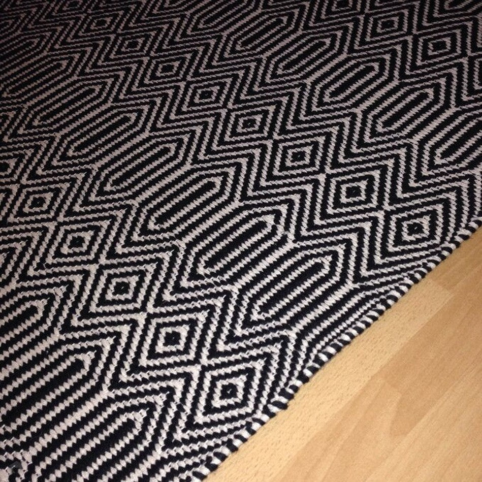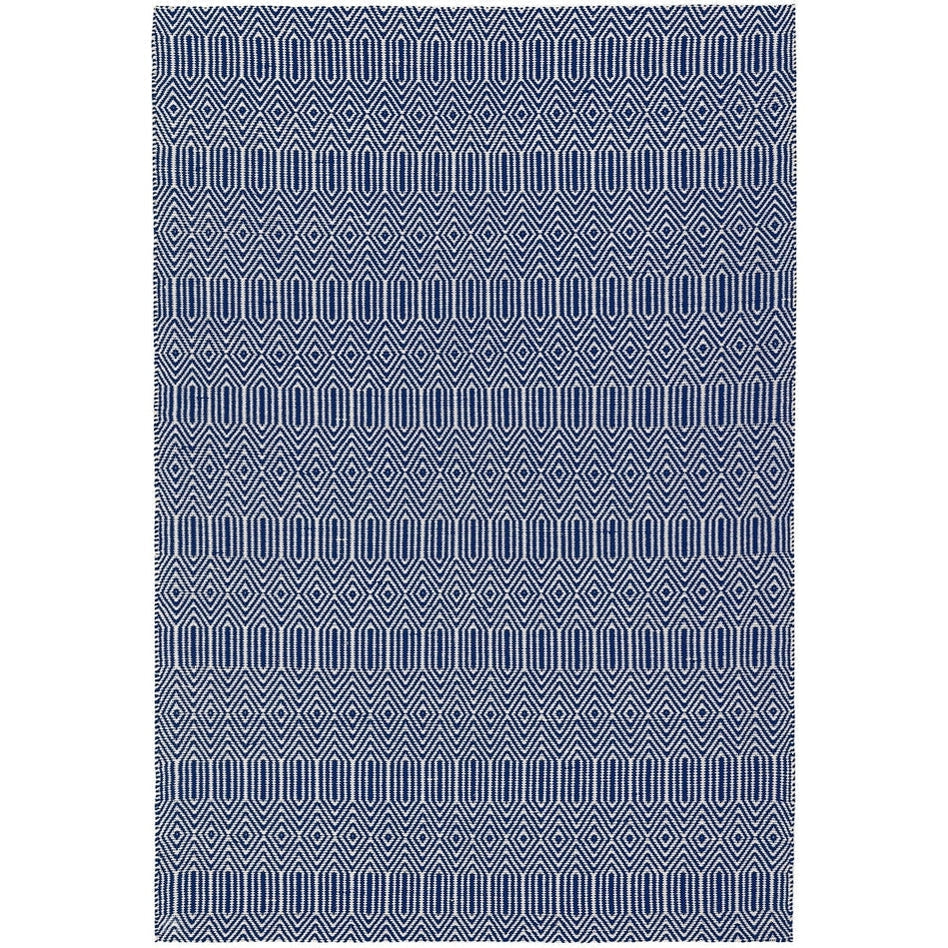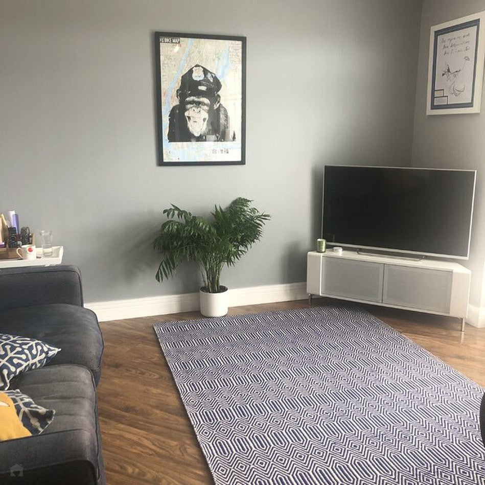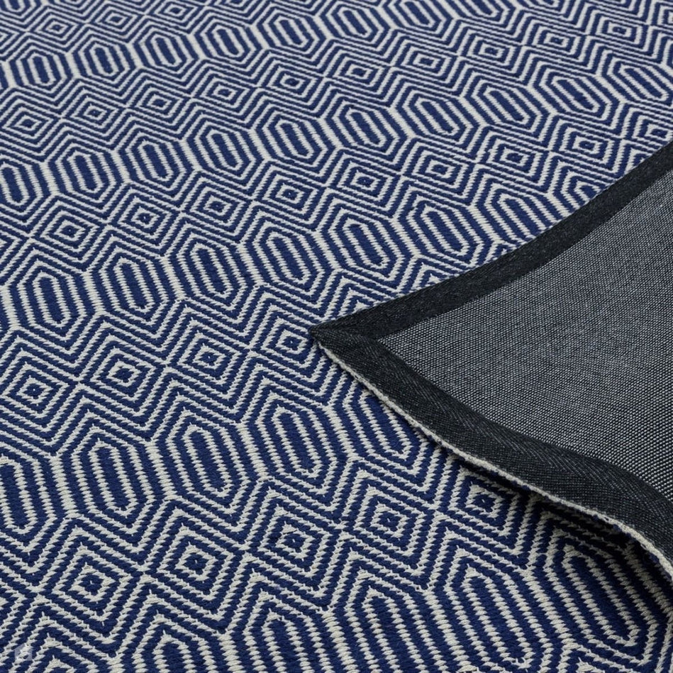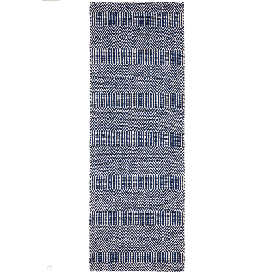 Its geometric diamond pattern is rendered in deep navy blue and soft ivory, creating a striking visual rhythm that feels modern yet grounded. The smooth wool fibres lend softness underfoot, while the cotton base provides stability and structure, making this rug a stylish choice for living rooms, hallways, and open-plan spaces. Sloan draws inspiration from traditional hand-woven textiles, featuring rhythmic geometric motifs that echo ethnic and tribal design heritage redefined in modern geometric simplicity through clean lines and balanced symmetry for minimalist, Scandinavian, or urban interiors. Sloan brings effortless sophistication to contemporary living spaces.