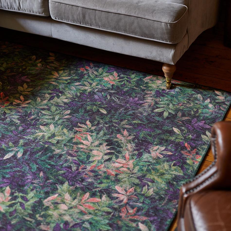 The Clarke & Clarke Congo Mulberry Washable Rug brings lush botanical depth and expressive artistry to the modern home. Inspired by the natural canopy of tropical foliage, this rug captures a mesmerising play of light and shadow across a tapestry of greens and purples. The rich mulberry, violet, and sage tones intertwine with warm highlights of blush and coral, evoking the dappled vibrancy of sunlit leaves in a shaded woodland.