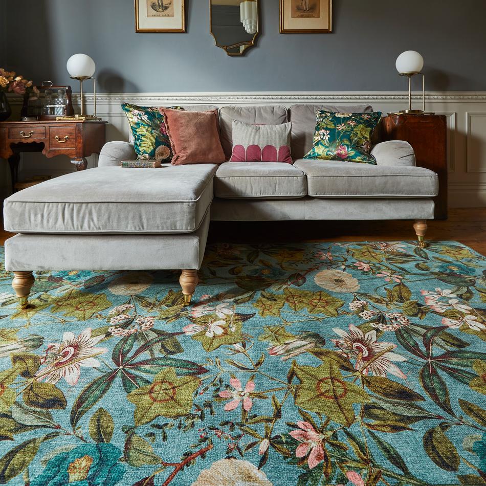 The Clarke & Clarke Passiflora Mineral Washable Rug captures the serene beauty of a sunlit conservatory, where vibrant botanical blooms unfurl against a tranquil mineral blue base. Lush foliage and painterly florals intertwine in a symphony of colour that evokes the freshness of a botanical greenhouse — elegant, expressive, and unmistakably Clarke & Clarke. Reflecting the brand’s love for maximalist pattern, bold colour, and artistic heritage, this design brings the vibrancy of their celebrated textiles to life underfoot.