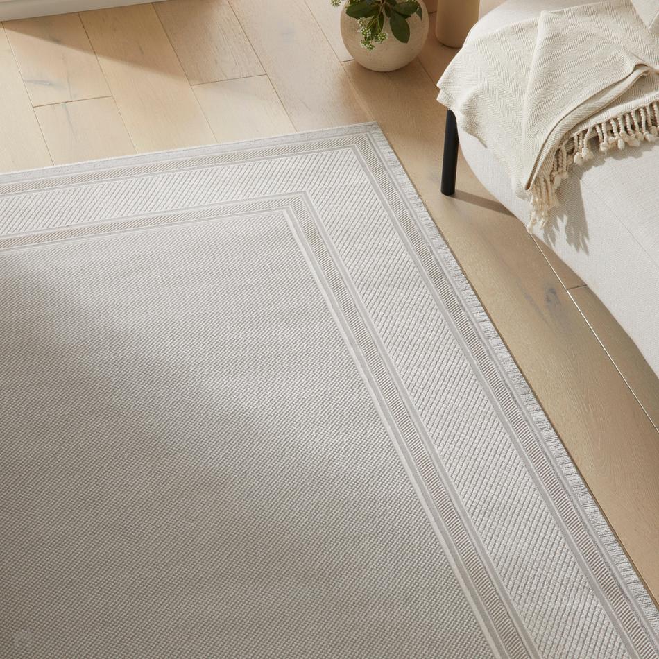The Olivia OLI102 Grey/Beige Rug showcases refined simplicity through its minimalist bordered design and soft, tactile finish. Expertly machine-woven in Turkey from 100% high-quality polyester, it features a low-profile 8 mm pile with a smooth, subtly textured surface. The elegant geometric border pattern provides understated sophistication, while the soft neutral palette of grey and beige tones brings warmth and versatility to any modern home. With its durable, non-shedding construction and latex backing, this rug offers both comfort and practicality, making it a timeless addition to contemporary interiors.