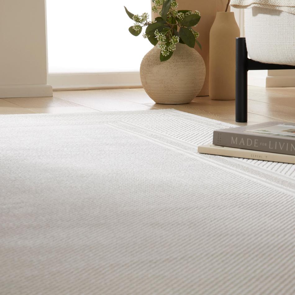 Warm Beige – Dominant within the main field, forming a soft neutral foundation that enhances the rug’s minimal aesthetic.
