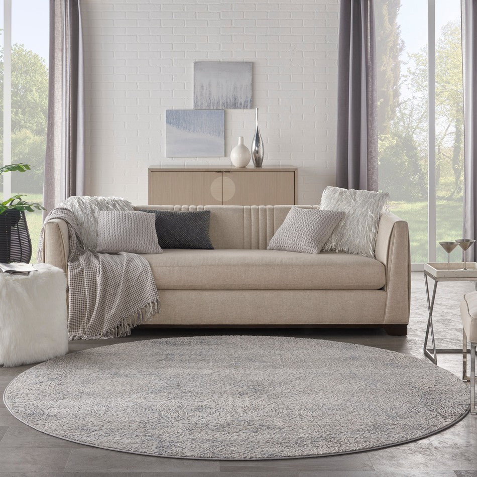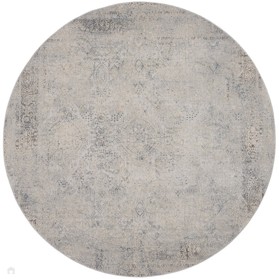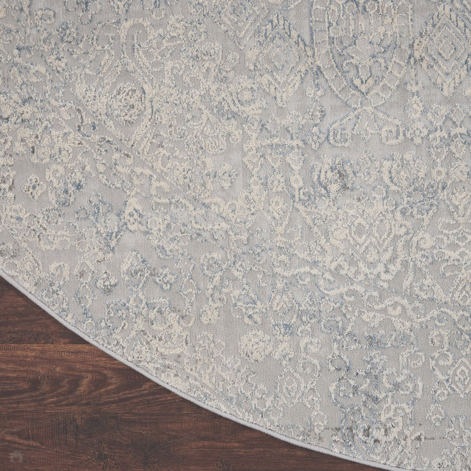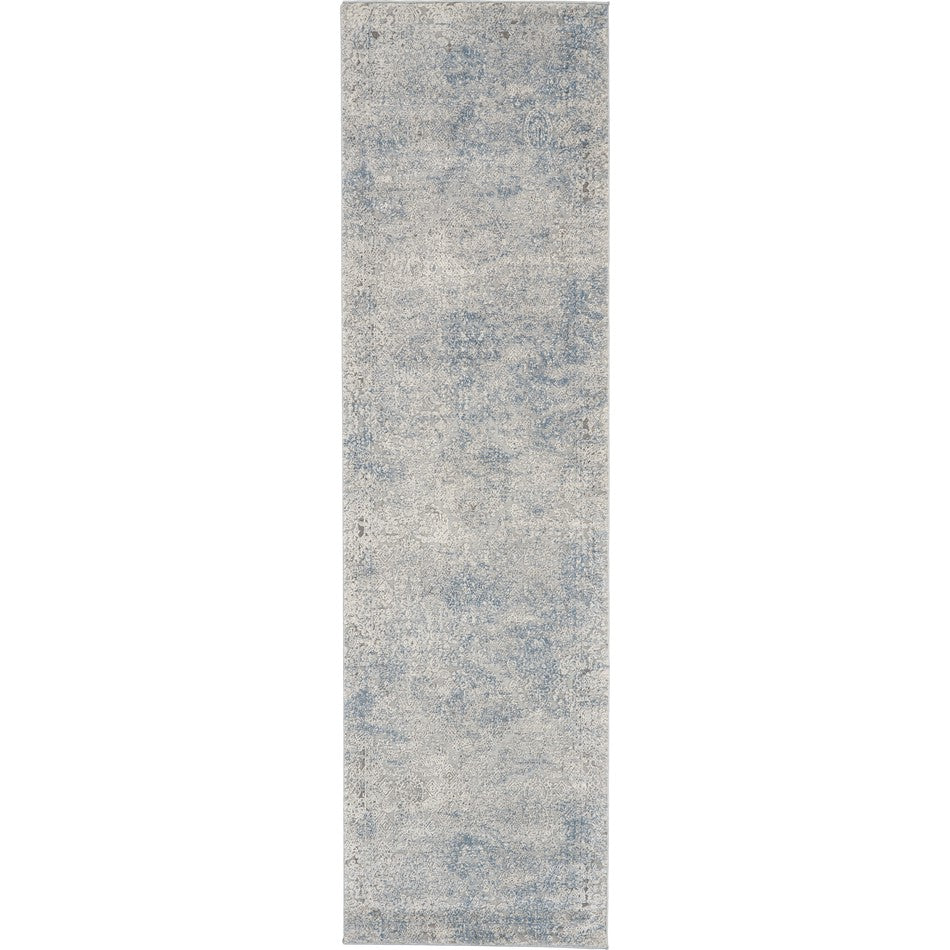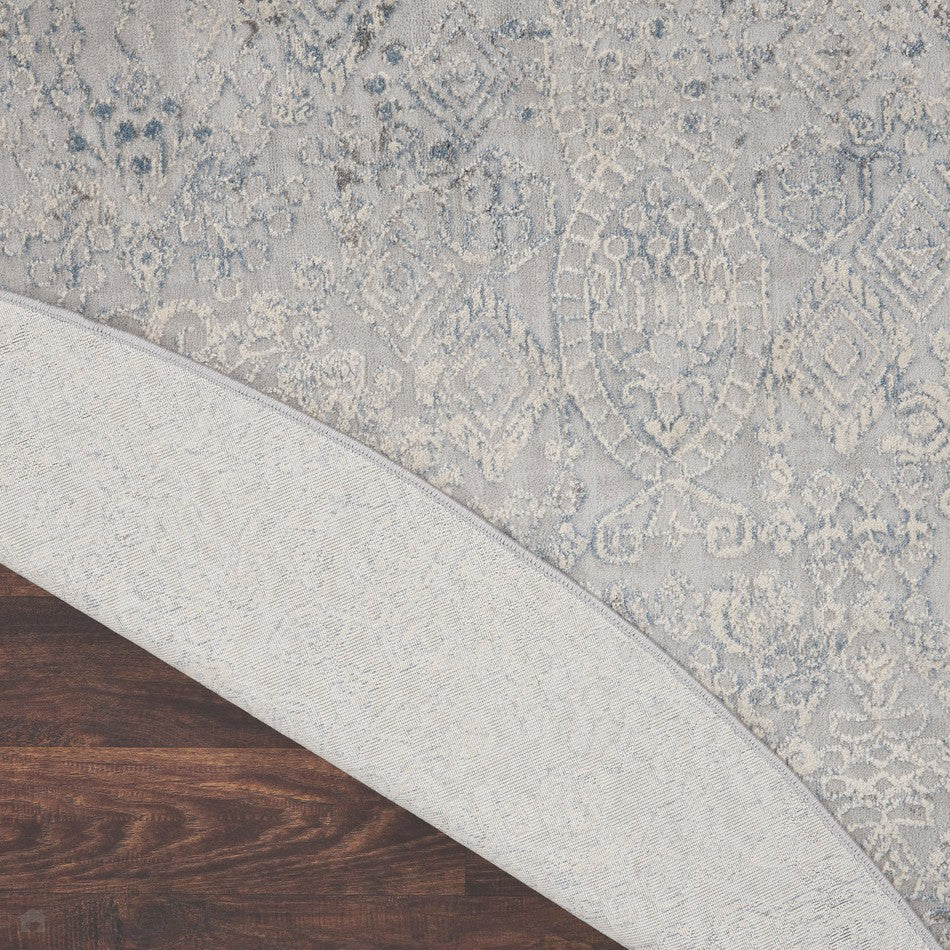 The Rustic Textures RUS09 Ivory/Grey/Blue Rug features a modern abstract distressed pattern with hints of vintage medallion detailing, artfully layered in Ivory, Light Grey, Steel Blue, Sky Blue, Charcoal Grey, Slate, and Silver. The 10 mm hi-low carved pile adds dimensionality, while subtle metallic threads create a luminous finish that shifts under different lighting. Crafted in Turkey using a polypropylene and polyester blend on a jute and latex backing, this rug is soft underfoot, durable, and low-shedding. Its calm, sophisticated palette makes it a versatile addition to living rooms, bedrooms, or transitional spaces, offering an elegant balance of texture, tone, and comfort.