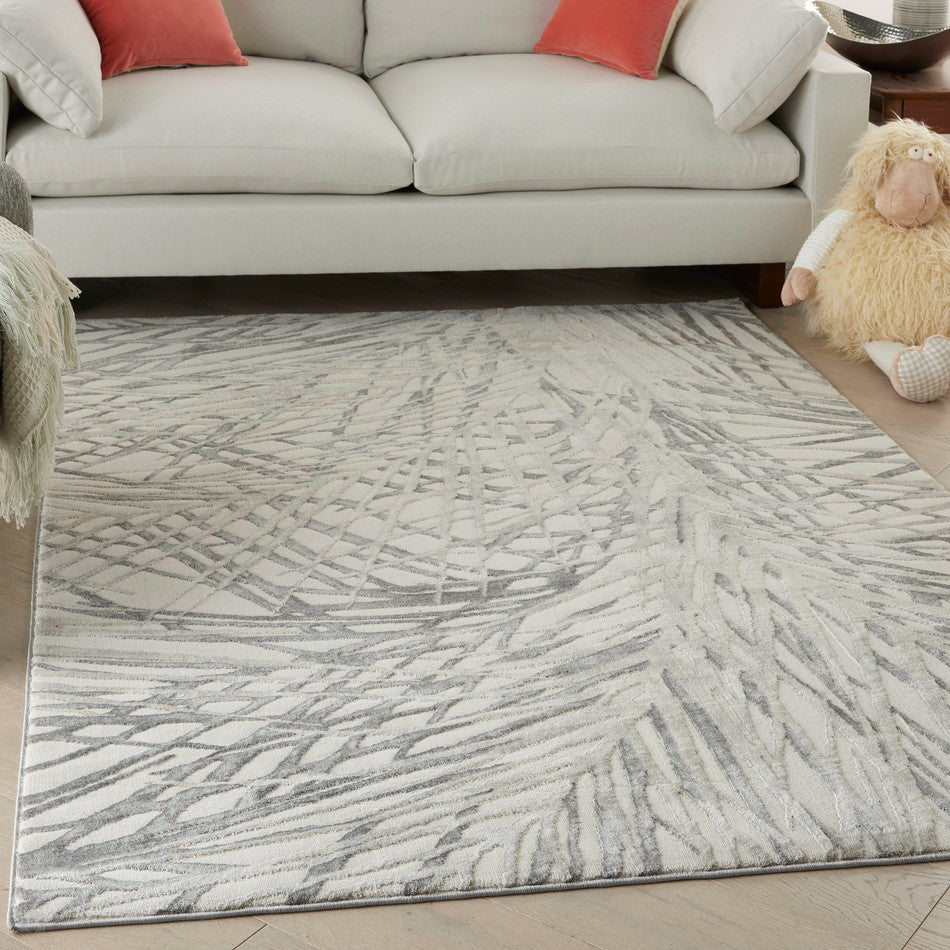 The Rustic Textures RUS17 Ivory/Grey Rug showcases a contemporary linear abstract design with a beautifully balanced palette of Ivory, Light Grey, Mid Grey, Charcoal, and Silver. The 10 mm hi-low carved pile produces striking texture and gentle sheen, offering a tactile surface that changes dynamically under light. Machine woven in Turkey with a durable polypropylene and polyester blend, it provides a soft, low-shedding, and easy-care finish ideal for busy homes. Its serene tones and intricate detailing make it a versatile choice for living rooms, bedrooms, or minimalist interiors, adding a touch of refinement and modern texture.