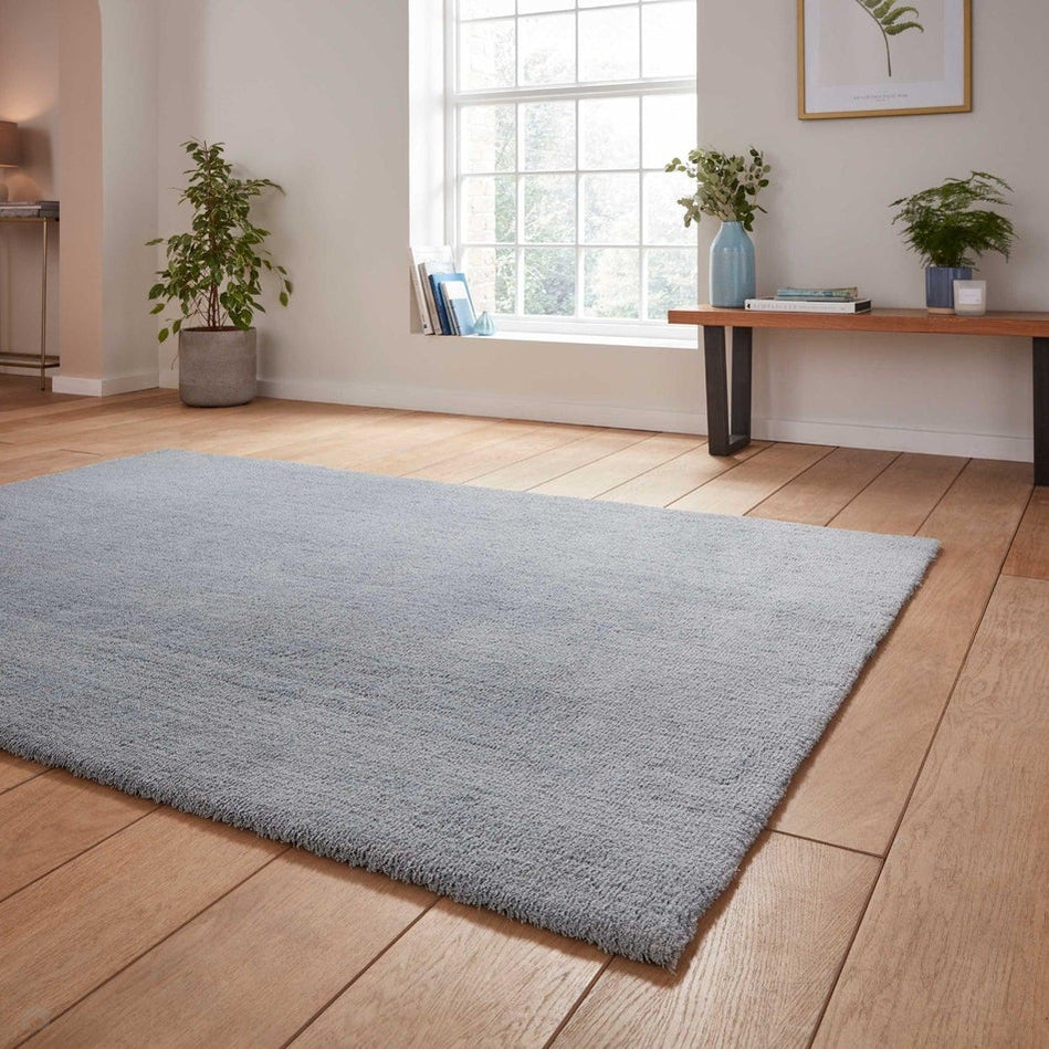 The soft-touch pile reveals subtle tonal variation of light blue, silver, and cool grey hues, blending together to create a tranquil and airy appearance. Enhanced by a delicate shimmer that gently reflects natural light, the rug radiates a soothing yet sophisticated energy, perfect for bright, modern spaces.