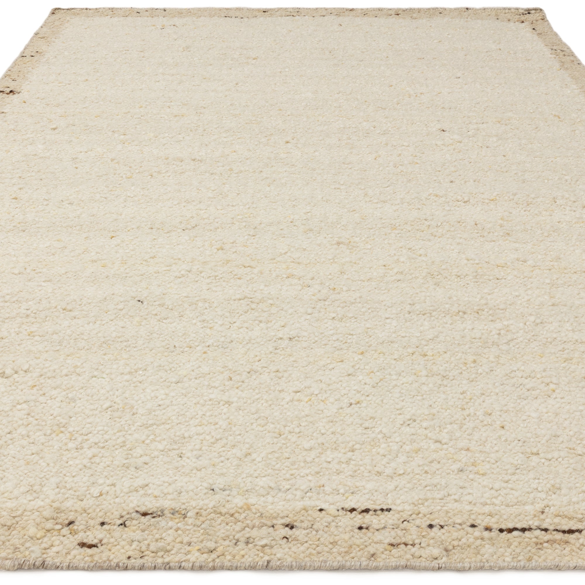 Crafted in India from 93% hand-spun wool and 7% cotton, the Napa Border Rug embodies understated sophistication through its minimalist design and artisanal craftsmanship. Hand-woven by skilled artisans, it highlights the beauty of natural, undyed wool with a soft, looped weave texture that adds warmth and tactility underfoot. The design features a simple tonal field framed by a contrasting Sandstone border, offering a sense of structure while preserving an organic, handcrafted feel. The low 10 mm pile maintains a refined, contemporary look, while the unbacked finish allows the natural flexibility of the weave to show through. Each piece carries subtle variations that celebrate its handmade origin and natural fibre composition.