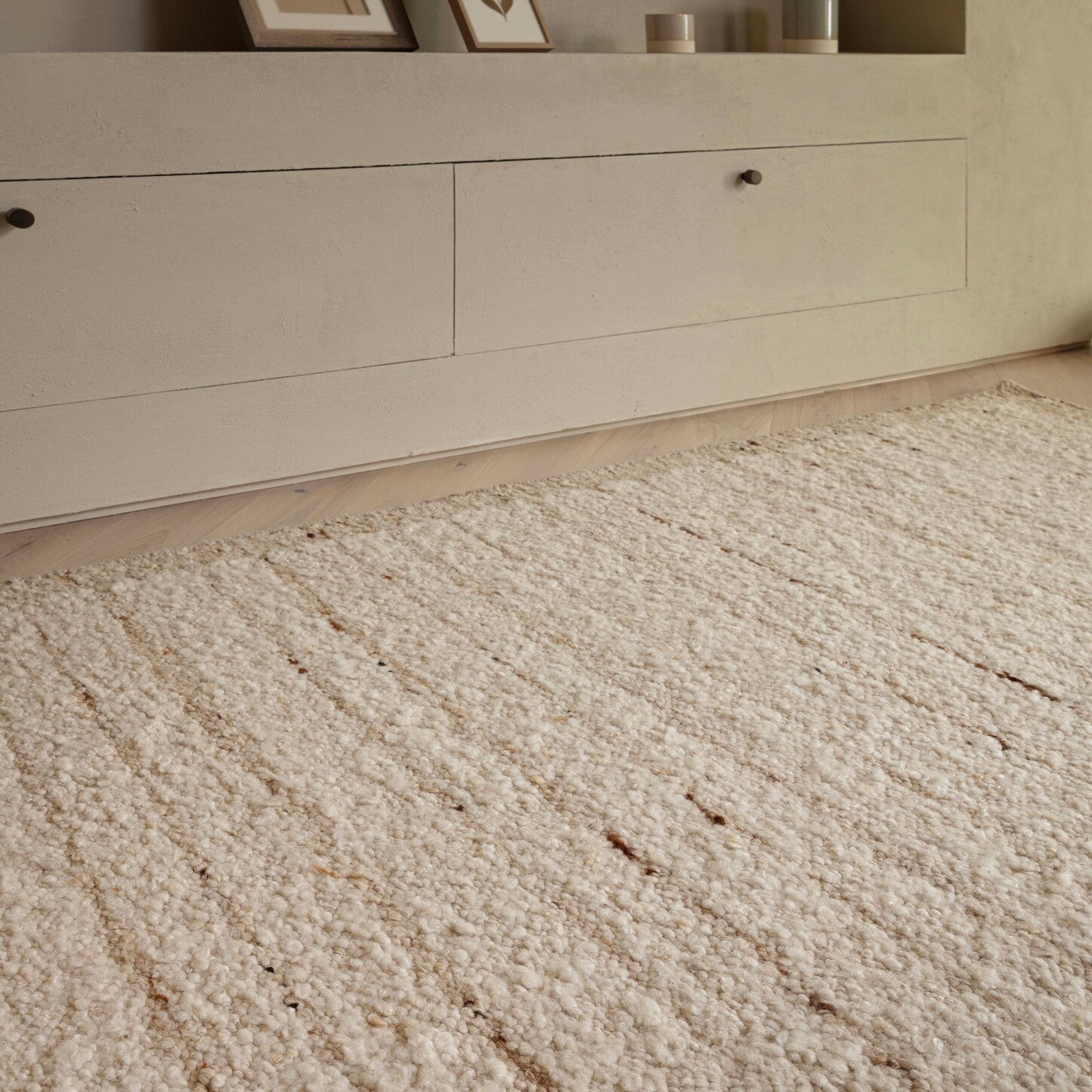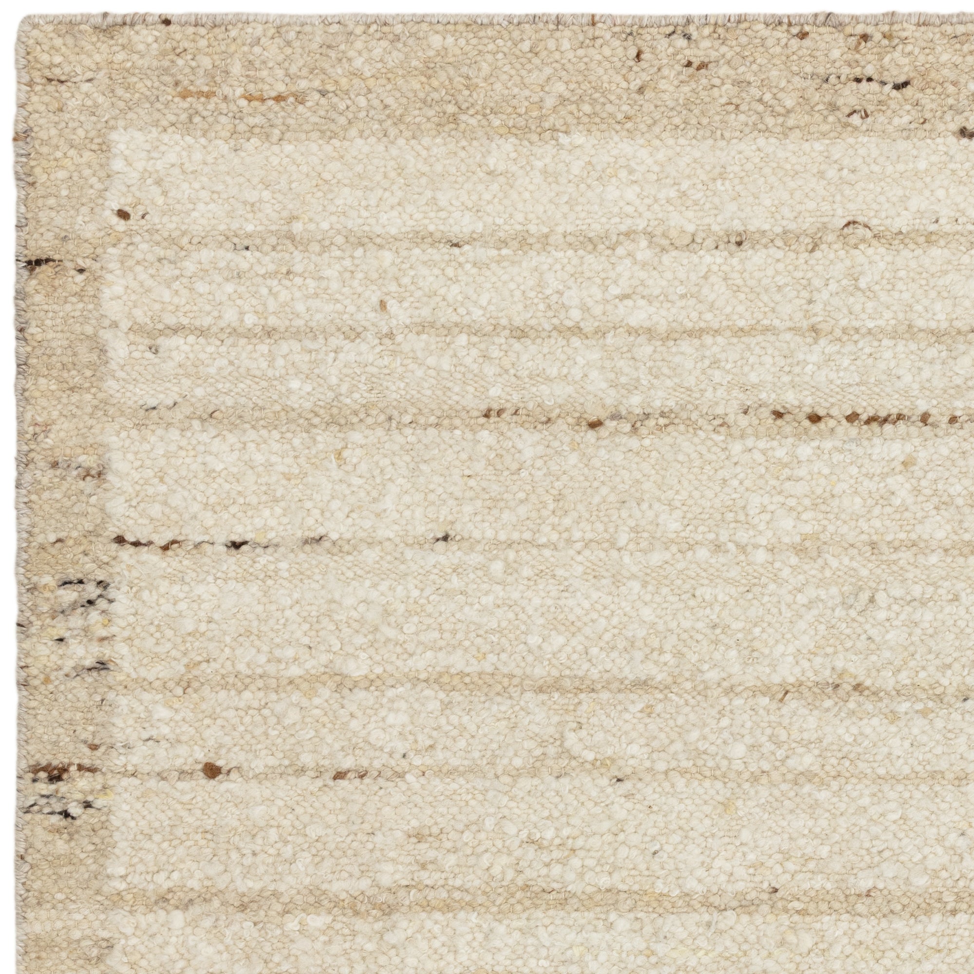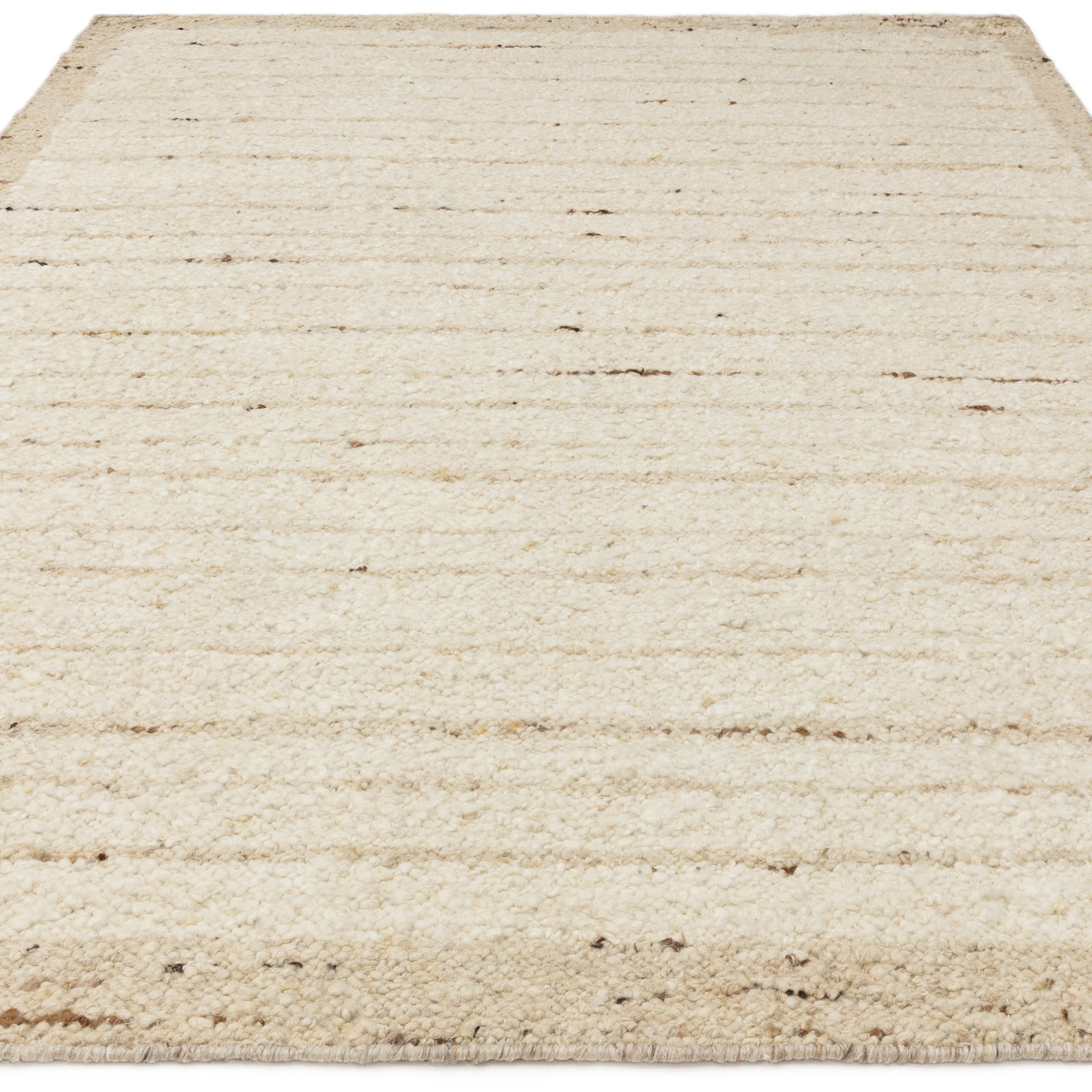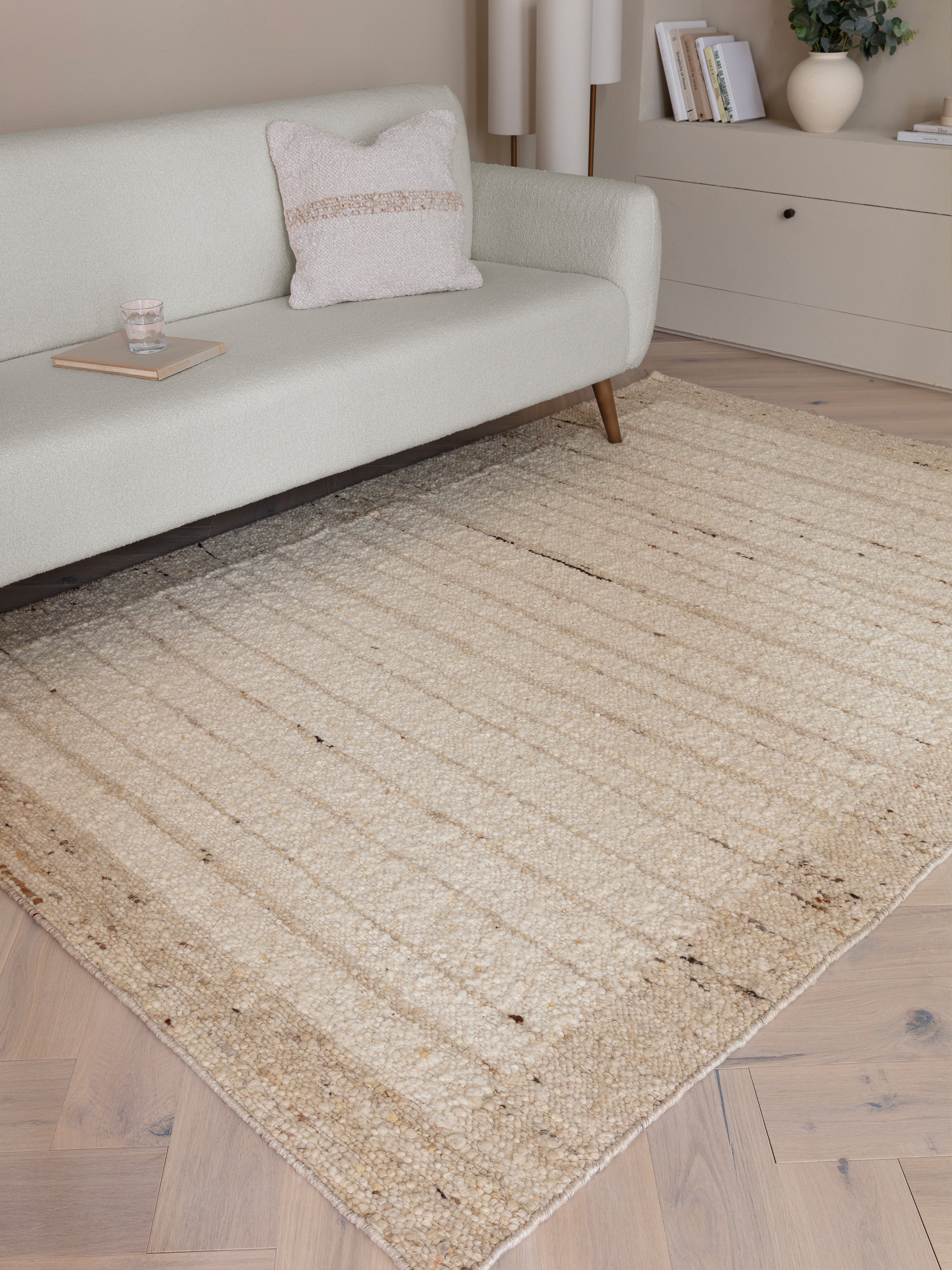 Crafted in India from 93% hand-spun wool and 7% cotton, the Napa Ladder Natural Beige Wool Rug embodies a refined simplicity rooted in natural materials and artisanal craftsmanship. Each rug is hand-woven by skilled artisans, using hand-spun wool that celebrates texture, depth, and irregularity. The design features a soft linear ladder pattern with subtle horizontal stripes that add gentle rhythm and movement across the surface. A contrasting Sandstone border delicately frames the edges, grounding the design and enhancing its handcrafted character. The looped weave offers a beautifully tactile texture underfoot, while the low 10 mm pile keeps the look modern and understated. Its unbacked construction maintains flexibility and natural authenticity, showcasing the raw beauty of undyed wool.