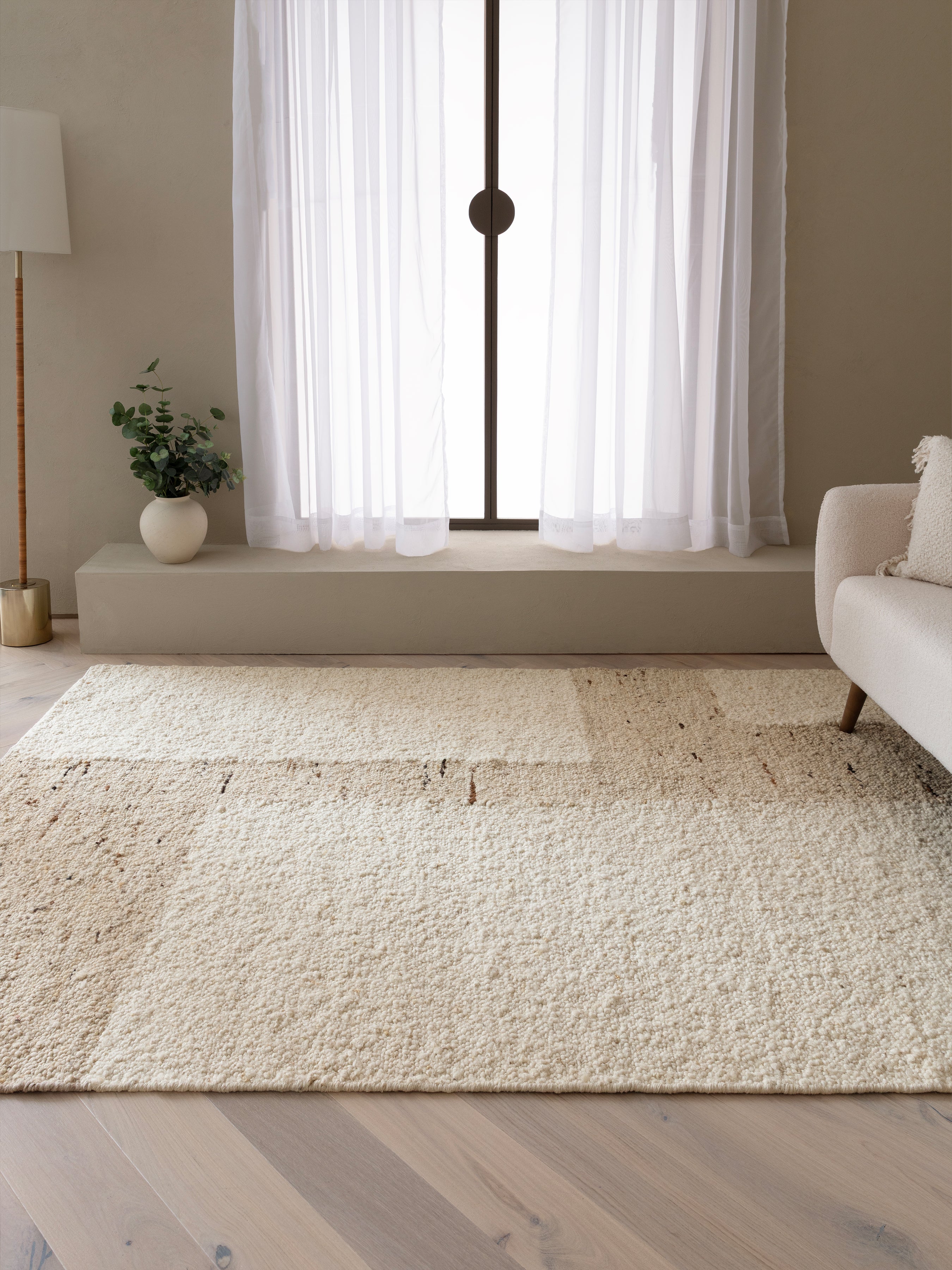 The Napa Tumbla Natural Beige Wool Rug showcases an organic block pattern defined by tonal transitions of Natural Beige, Sandstone, and Light Oatmeal. Hand-woven from hand-spun wool with a looped texture and low 10 mm pile, it balances artisanal irregularity with modern simplicity. Perfect for Scandi, Japandi, and neutral-toned interiors, it delivers warmth, depth, and timeless authenticity — an effortless expression of natural craft and contemporary design.