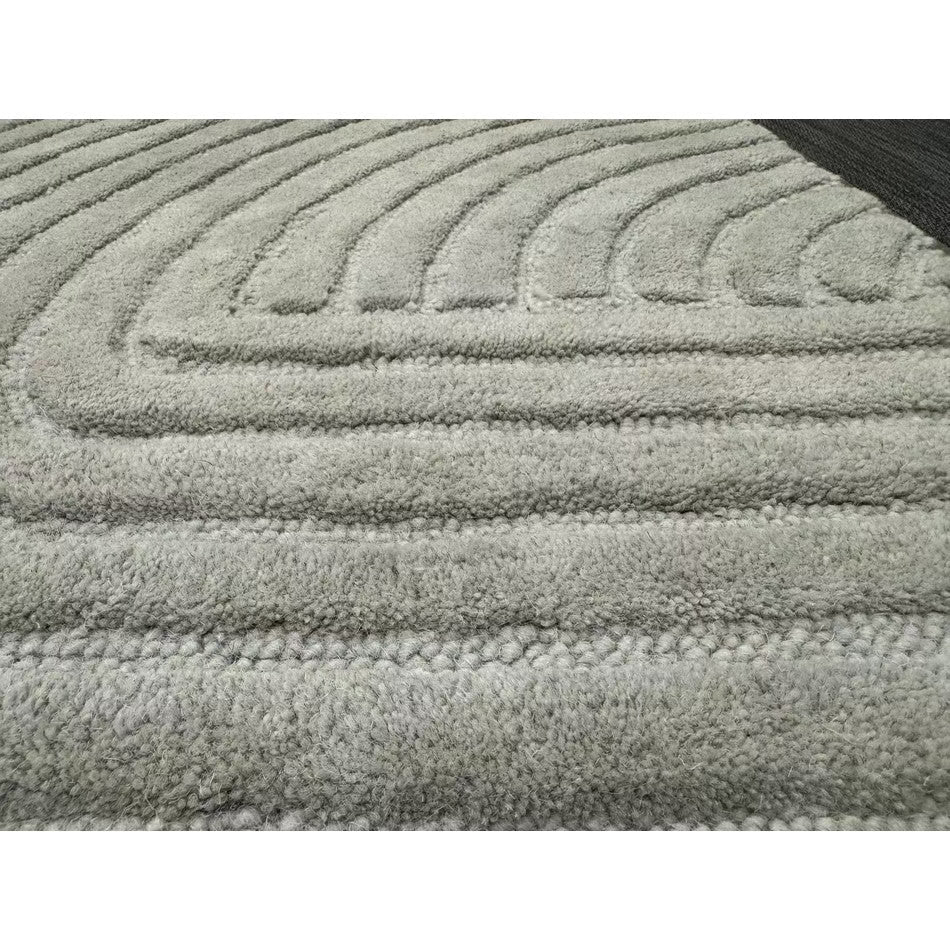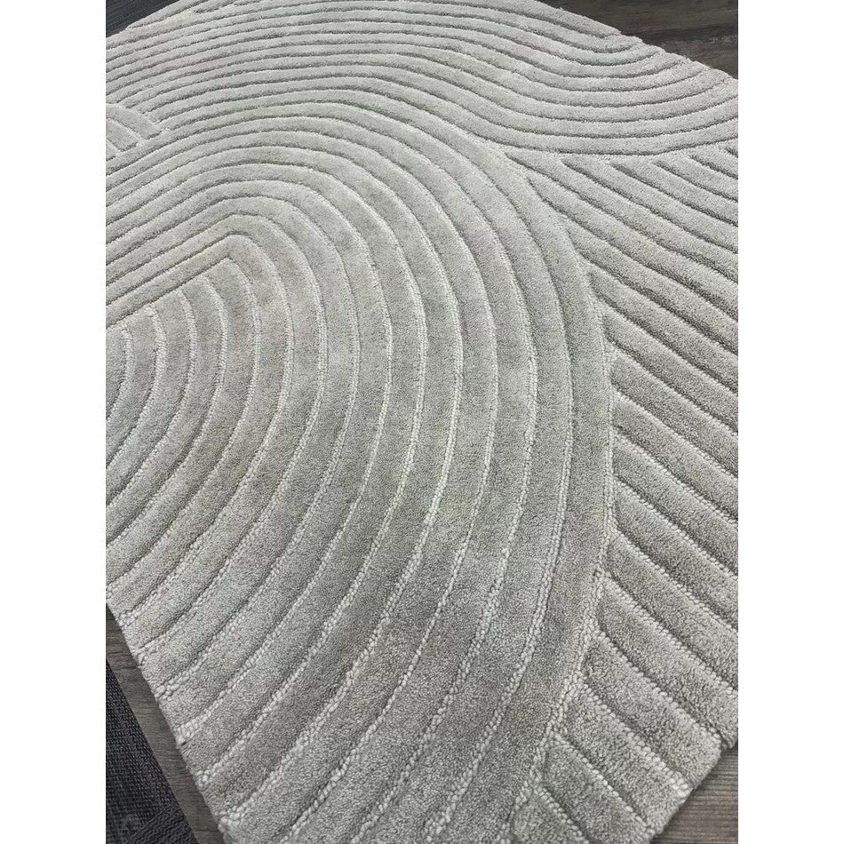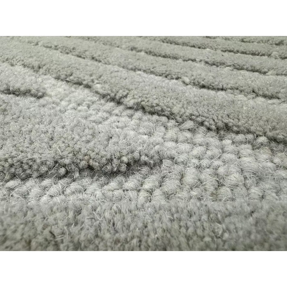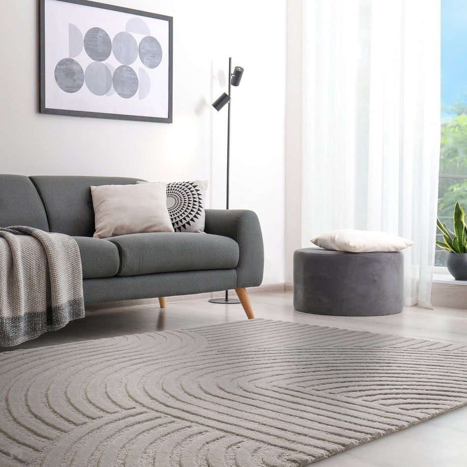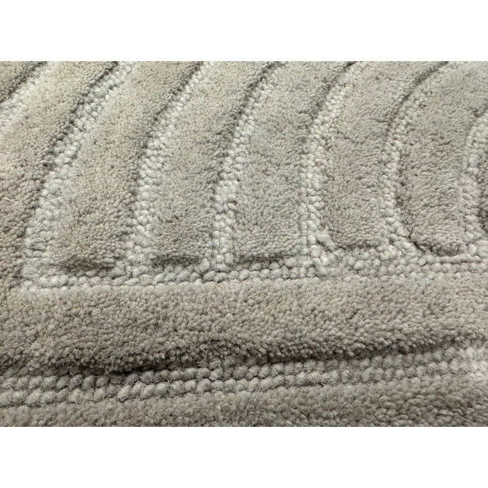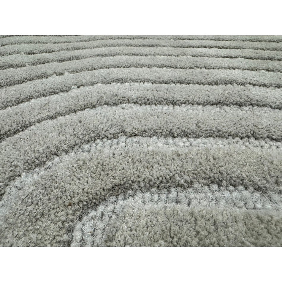 The Hague Modern Plain Geometric Wool Rug in Stone Grey delivers a beautifully balanced blend of modern sculptural design and tactile softness. Defined by its 3D hand-carved geometric pattern, the curved and linear ridges create architectural depth and a sense of movement across the surface. The loop pile base forms the foundation of the design, while the cut pile detailing introduces a contrasting raised texture, resulting in a luxurious hi-low finish that subtly catches the light.