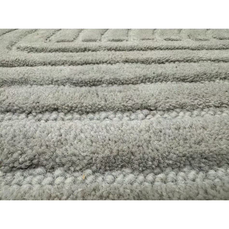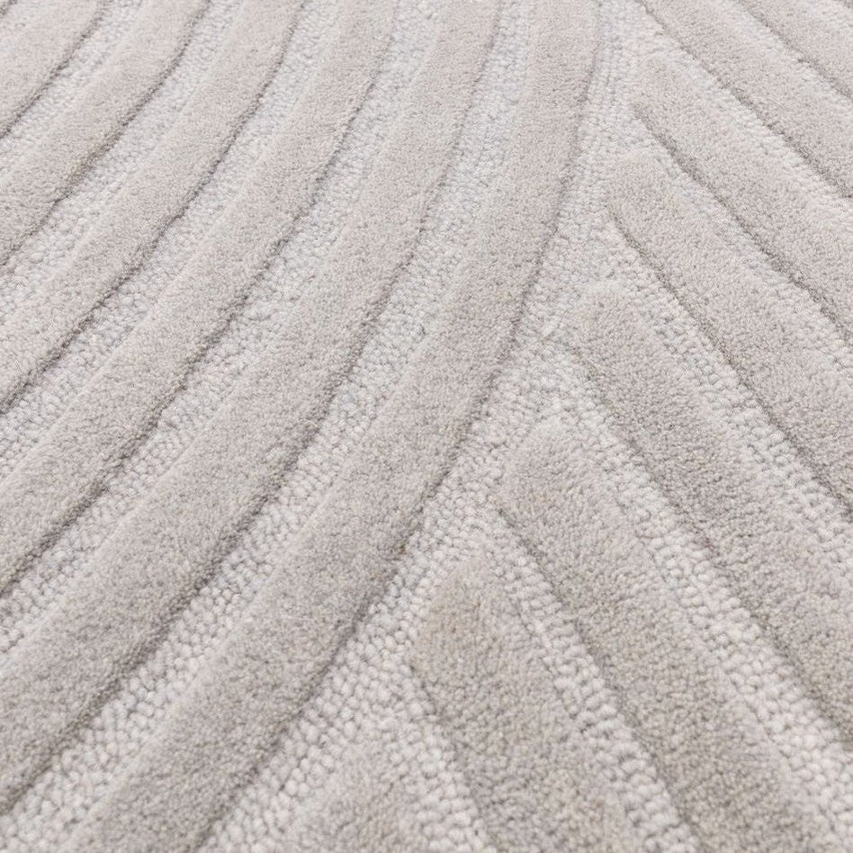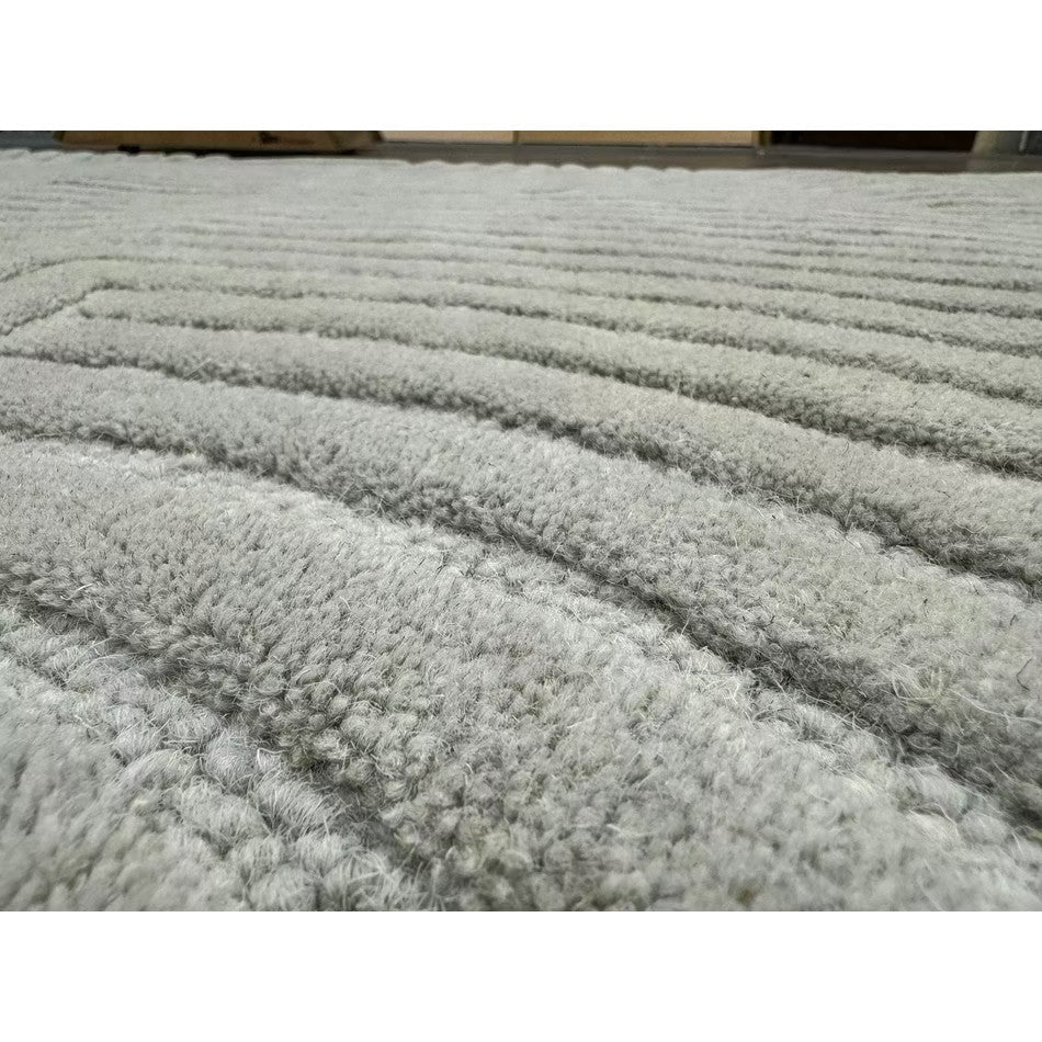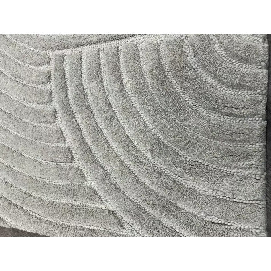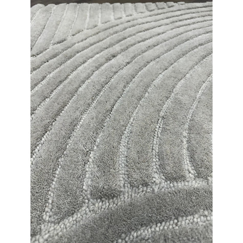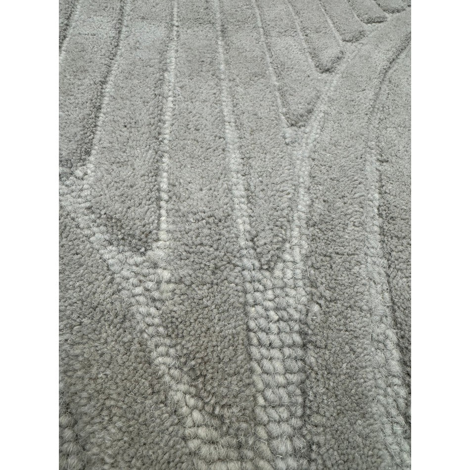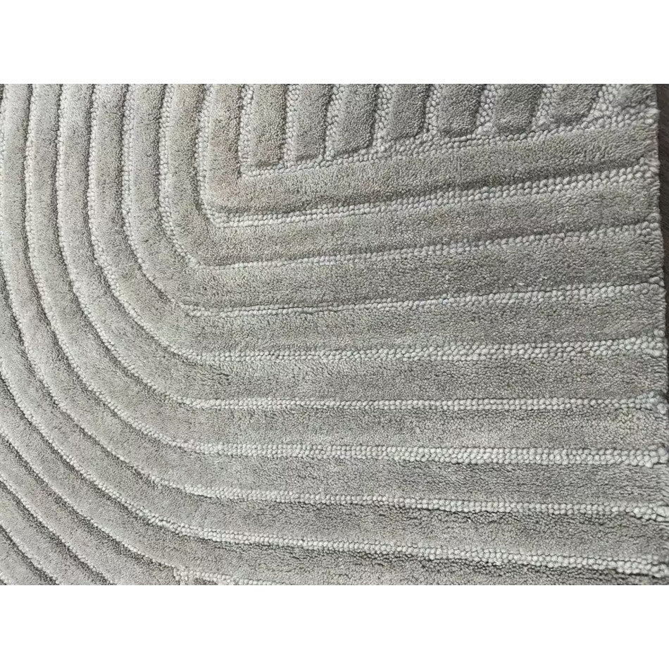 The Hague Modern Plain Geometric Wool Rug in Stone Grey delivers a beautifully balanced blend of modern sculptural design and tactile softness. Defined by its 3D hand-carved geometric pattern, the curved and linear ridges create architectural depth and a sense of movement across the surface. The loop pile base forms the foundation of the design, while the cut pile detailing introduces a contrasting raised texture, resulting in a luxurious hi-low finish that subtly catches the light.