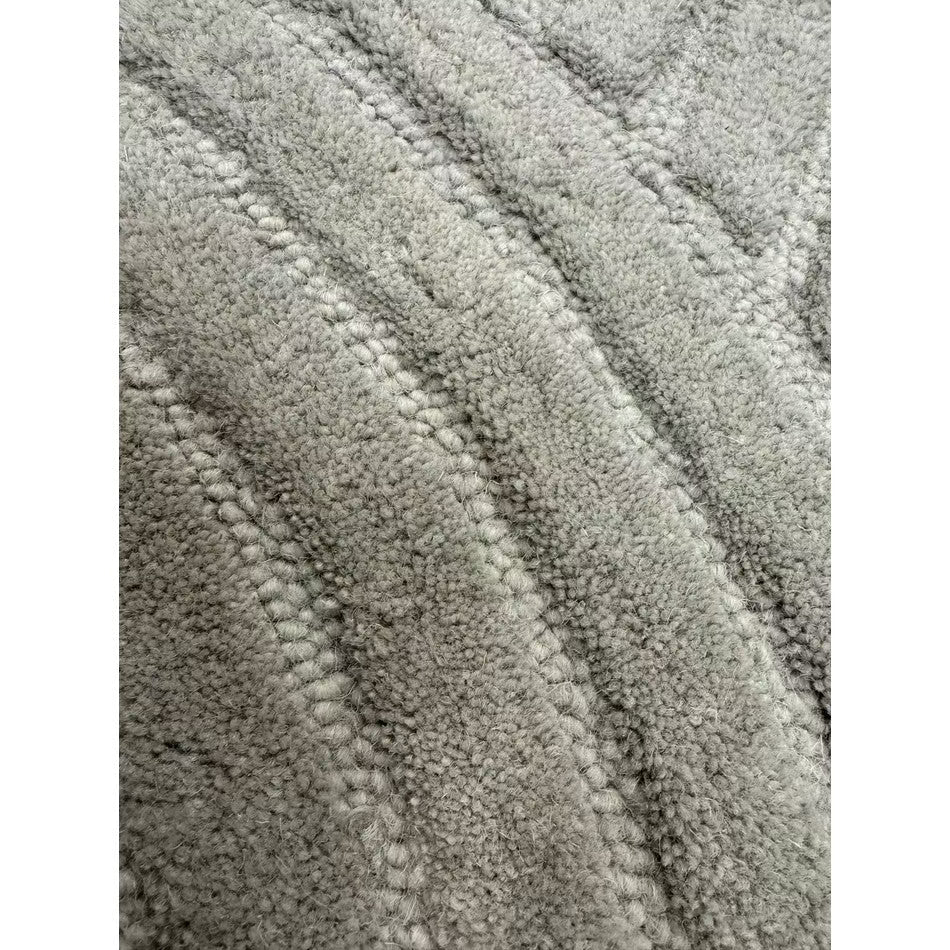 The Hague Stone Grey Wool Rug features a loop pile base with a cut pile pattern, hand-carved to create a 3D geometric hi-low texture that highlights craftsmanship and dimension. Made from 100% wool with a cotton and latex backing, it combines durability with a soft tactile finish. The elegant Muted Grey hue enhances the sculptural form, making it a versatile statement piece suited to minimalist and contemporary interiors alike.