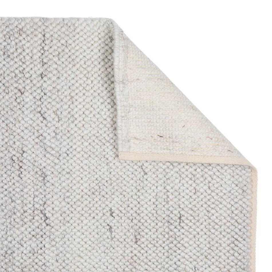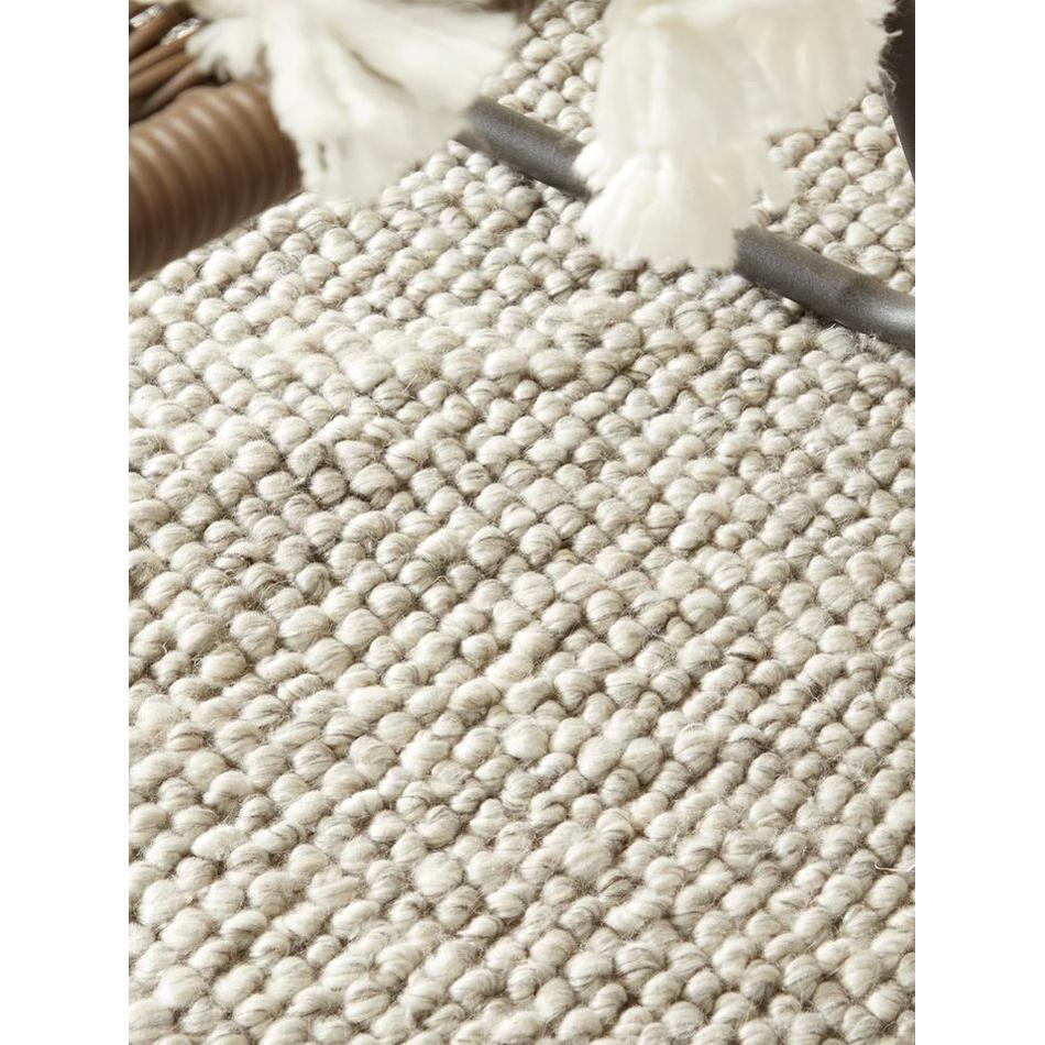 The La Playa rug features a mottled beaded pebble texture with a soft, supple, blanket-like construction. It is not rigid, allowing for slight stretch and natural movement. This rug has a delicate loop pile, and if any loops are pulled, snagged, or caught by pets or heels, the rug may run.