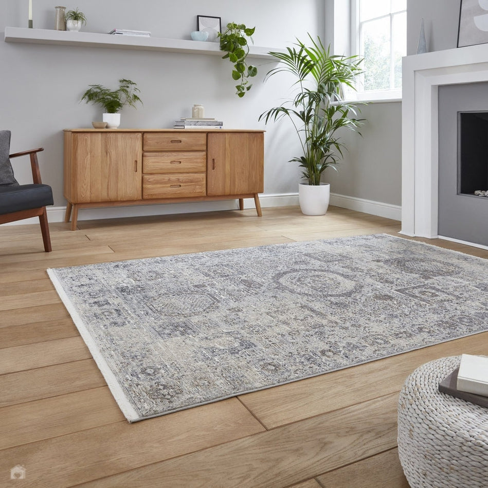 The Athena 18599 Grey/Blue Rug is machine-woven with precision to provide a luxurious finish and long-lasting quality. Its neutral colour palette, featuring grey with a slight steel-blue undertone, makes it versatile and easy to pair with a wide range of décor schemes.