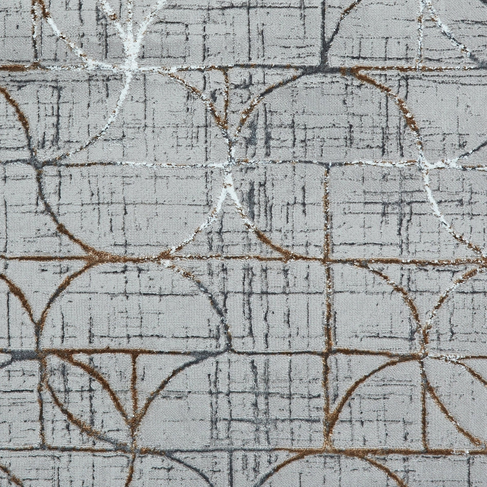 Featuring a geometric motif of intersecting arcs and linear detailing, the design showcases a harmonious blend of texture and tone. The metallic gold accents add a subtle yet luxurious sheen, while the cool Grey base and contrasting Charcoal lines create depth and definition, giving this rug a refined, structured appearance.
