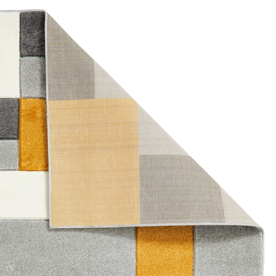 The Matrix MT61 Grey/Yellow Rug showcases a striking geometric block design brought to life with hand-carved detailing that enhances texture and depth. The tonal interplay of Cream, Grey, and Golden Ochre creates a modern yet inviting aesthetic, perfect for adding personality to living rooms, bedrooms, or contemporary interiors. Made from 100% heat-set polypropylene, it features a 1 cm short pile that is soft underfoot, non-shedding, and easy to maintain. The machine-woven, high-density construction ensures long-lasting shape retention and everyday practicality, making this rug a stylish and durable choice for any modern home.