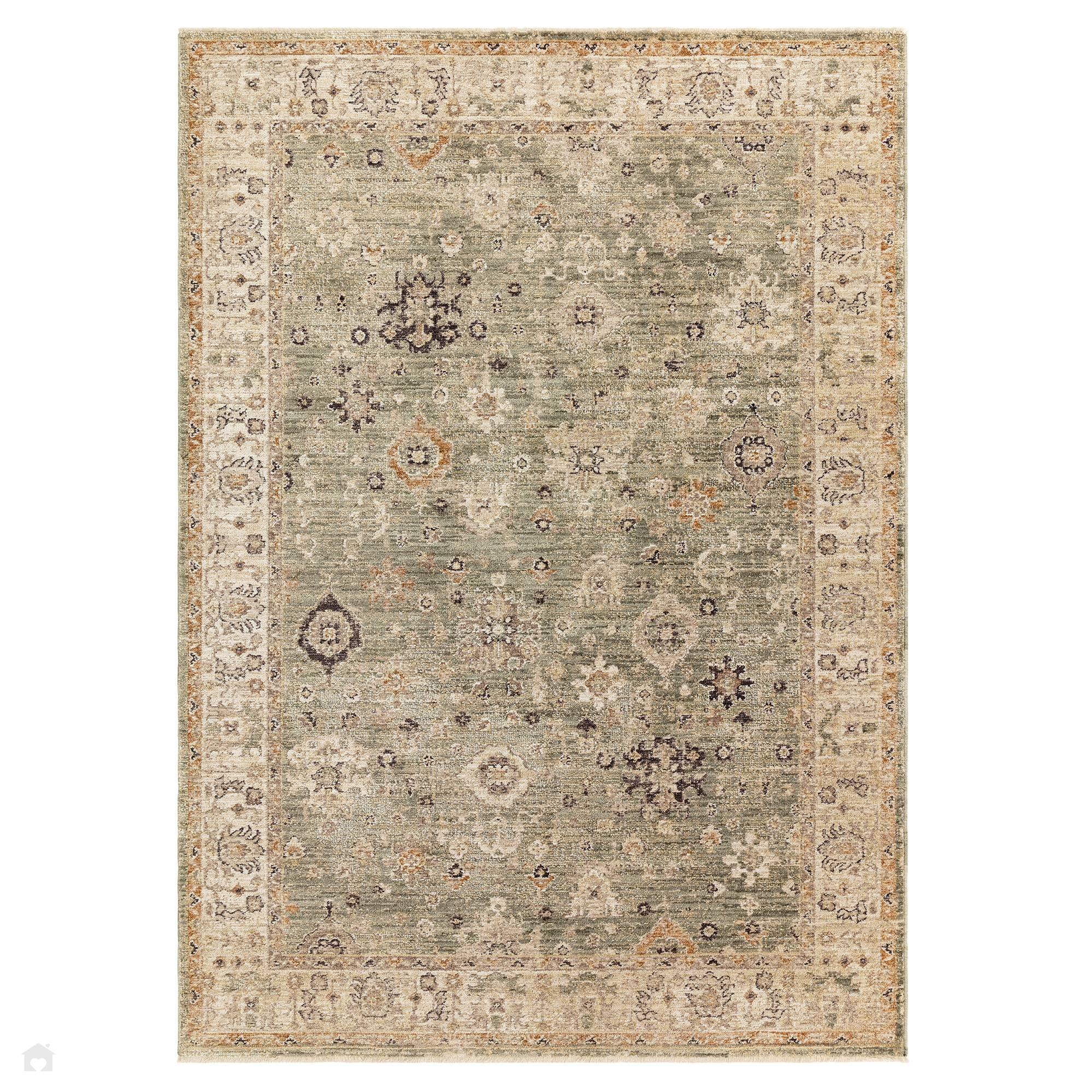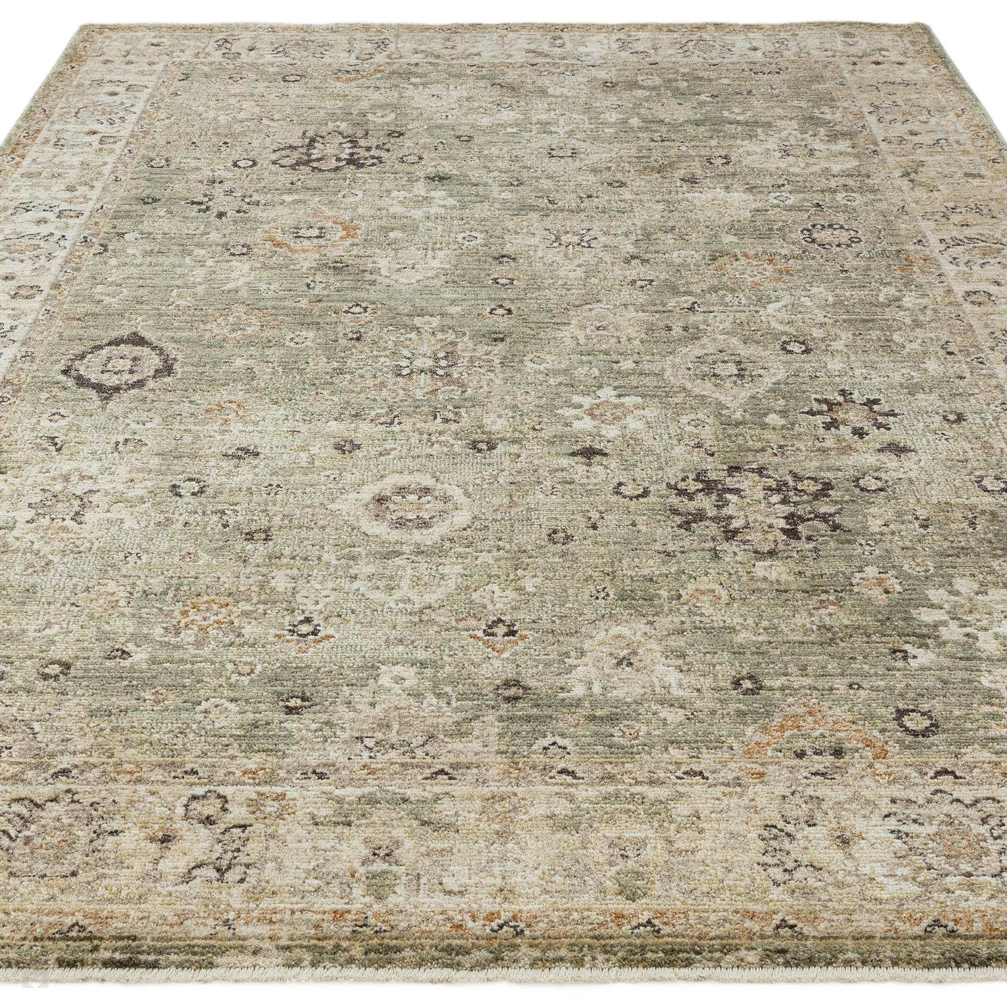 The Heriz Ornate Green Rug showcases a traditional Persian-inspired floral and medallion pattern softly faded for a vintage, antique effect. Its space-dyed polyester yarns introduce natural tonal shifts and a delicate lustrous sheen, highlighting the rug’s layered high-low texture. With its 6mm short pile, the rug offers durability and easy maintenance, making it a perfect fit for living rooms, dining areas, or calming neutral-green interiors. Combining Sage Green, Ivory, Beige, and Burnished Gold, this piece strikes the perfect balance between timeless elegance and modern practicality.