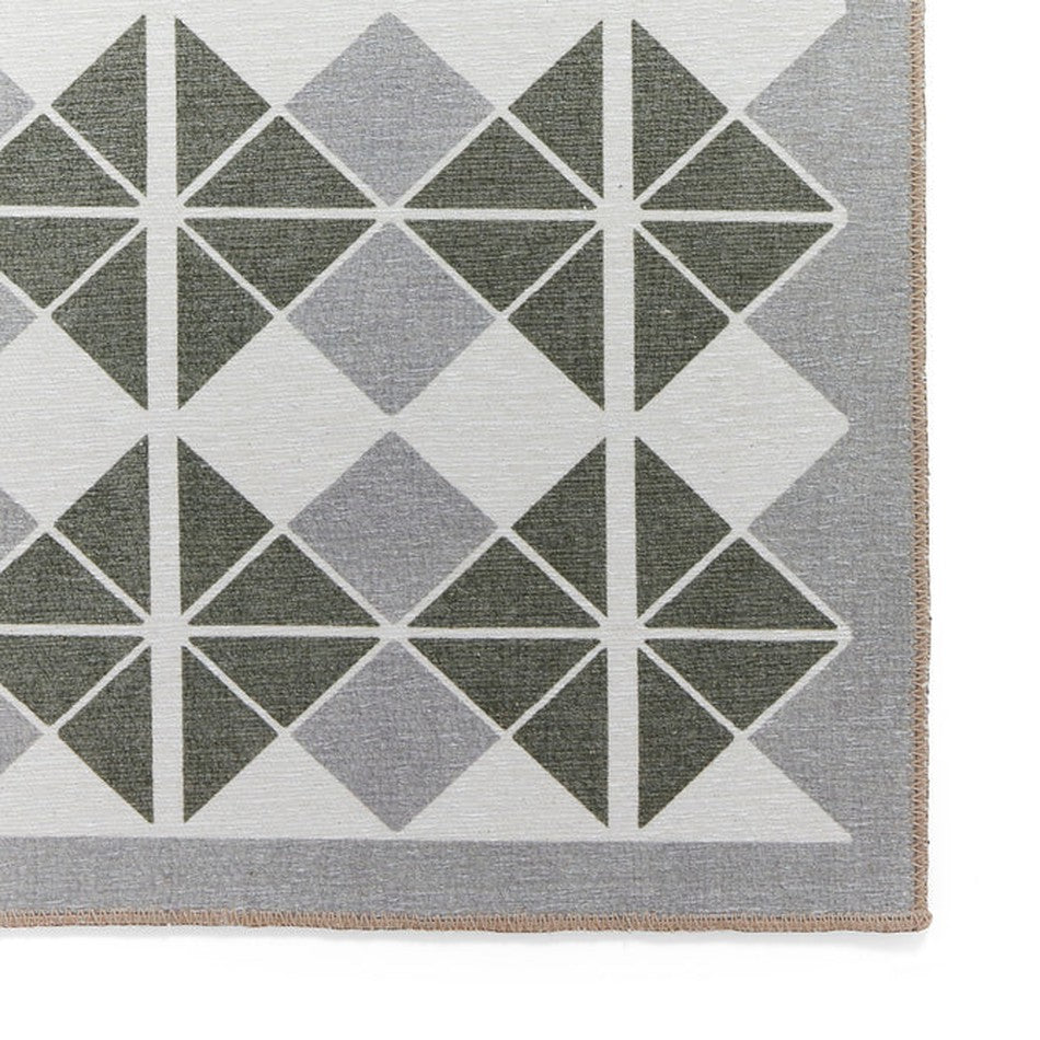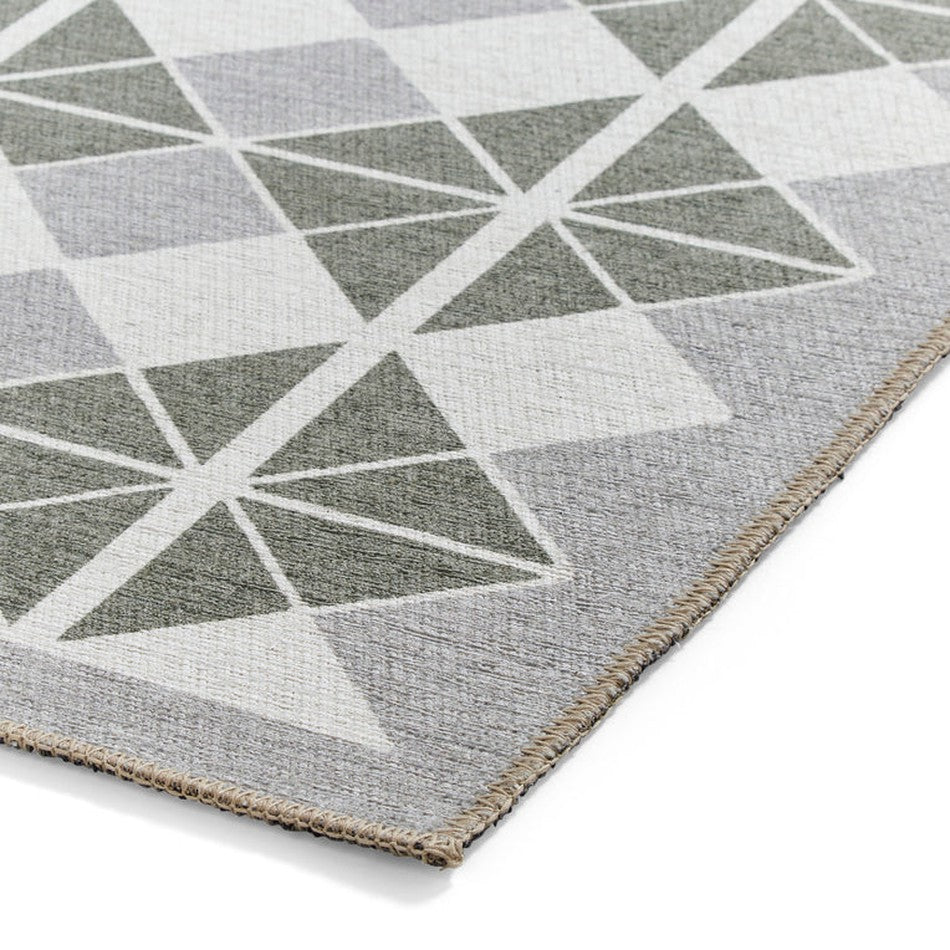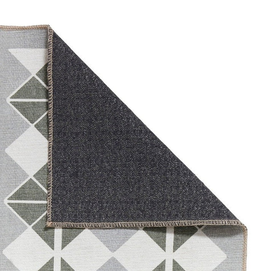 The Washable Victoria H1184 Grey/Green Rug blends modern geometric precision with vintage-inspired elegance, showcasing a distinctive diamond grid and triangular tessellation pattern that adds rhythm and depth to any contemporary setting. Crafted from mixed recycled polyester in a digitally printed flatweave, it delivers crisp detailing with a smooth, low-profile texture while promoting the use of sustainable materials. Made in Turkey using advanced digital printing technology, it balances durability, design accuracy, and easy care. With its 0.2cm slim pile height, it fits neatly beneath furniture and is ideal for high-traffic or multifunctional areas. The integrated anti-slip backing enhances safety, stability, and adds an extra layer of practicality for everyday use.