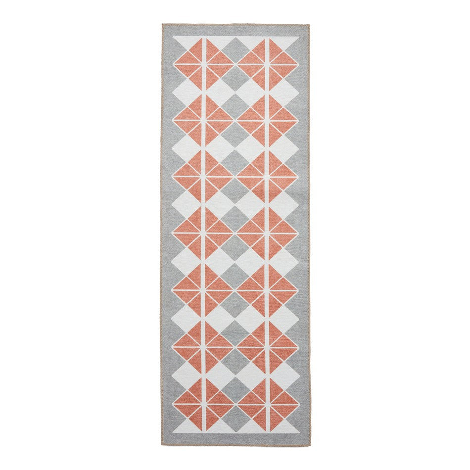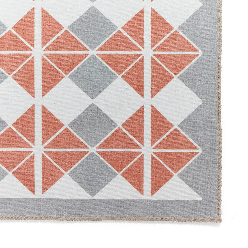 The Washable Victoria H1184 Grey/Orange Rug perfectly fuses modern geometry with vintage-inspired character, showcasing a bold diamond grid and triangular tessellation design that adds energy and warmth to any contemporary space. Crafted from mixed recycled polyester in a digitally printed flatweave, it provides crisp, durable detailing with a smooth, low-profile texture while promoting the use of sustainable materials. Made in Turkey using advanced digital printing technology, this rug combines visual precision with long-lasting practicality. With its 0.2cm slim pile height, it’s ideal for high-traffic areas and fits seamlessly beneath furniture. The integrated anti-slip backing enhances safety, stability, and adds an extra layer of practicality for everyday use.