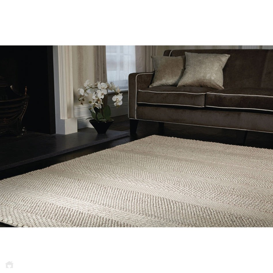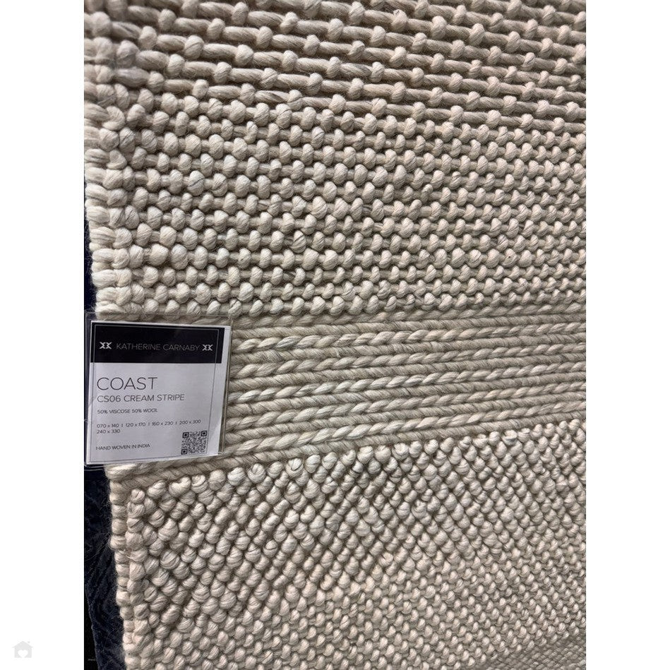 The Katherine Carnaby Coast CS06 Cream Stripe Rug is a refined flatweave piece that combines Cream, Ivory, Subtle Grey Tones, and Natural Beige Flecks in a softly striped pattern. Its wool and viscose blend introduces both resilience and a gentle lustre, while the flatweave low profile makes it ideal for layering and high-traffic areas. With its calm tonal interplay and tactile finish, this rug complements living rooms, dining areas, and bedrooms alike, making it a versatile choice for interiors seeking relaxed sophistication with a designer edge.