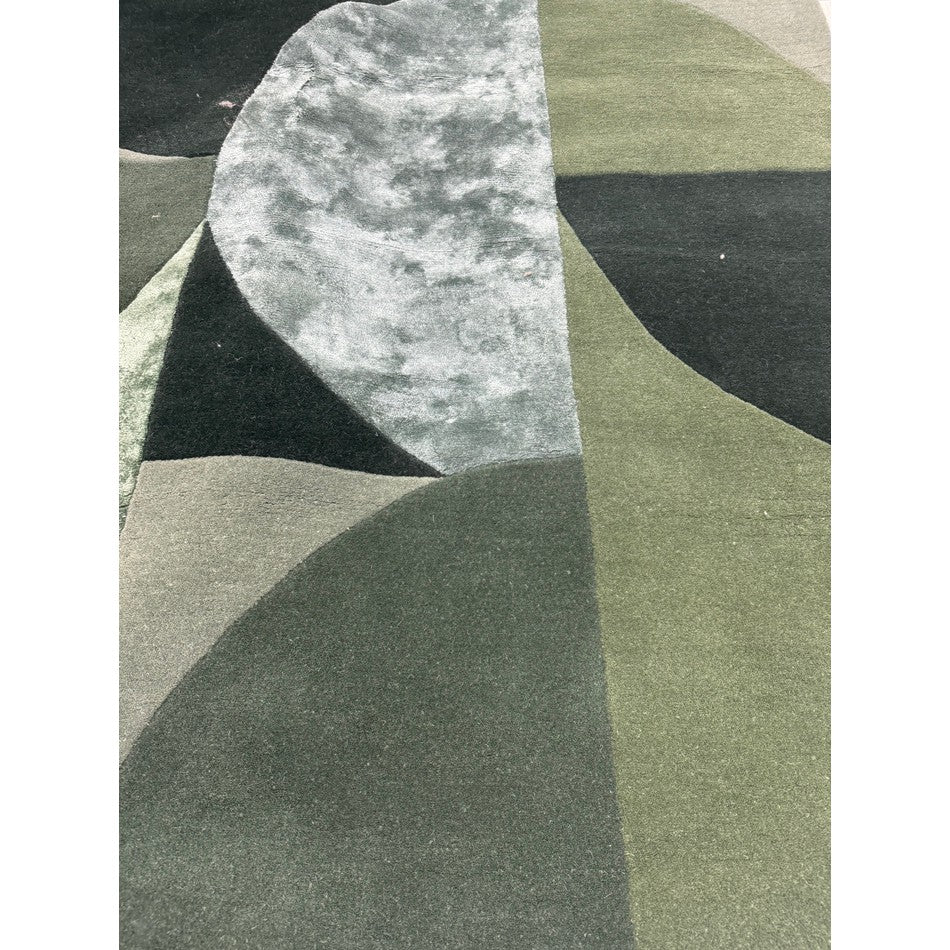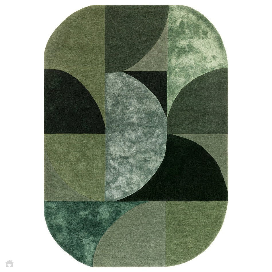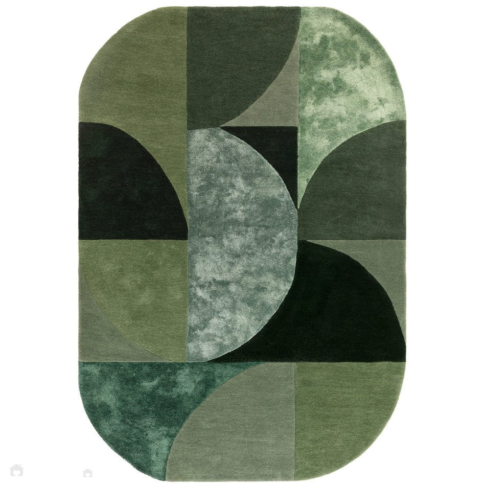 The Matrix MAX75 Oval Forest Green Rug merges modern geometric artistry with the organic richness of nature-inspired tones. Its distinctive oval silhouette softens the angular geometry of overlapping semi-circles and panels, creating a design that feels structured yet fluid. A sophisticated palette of forest green, emerald, moss, olive, charcoal, and muted sage brings layered tonal depth, with a gentle lustre enhancing the interplay between light and shadow. The balance of matte and shimmering fibres gives this piece a contemporary sculptural quality, while its rich, earthy tones introduce warmth and elegance to any space. Expertly hand-woven in India from a premium 70% wool and 30% viscose blend, the MAX75 offers both durability and luxurious tactility.