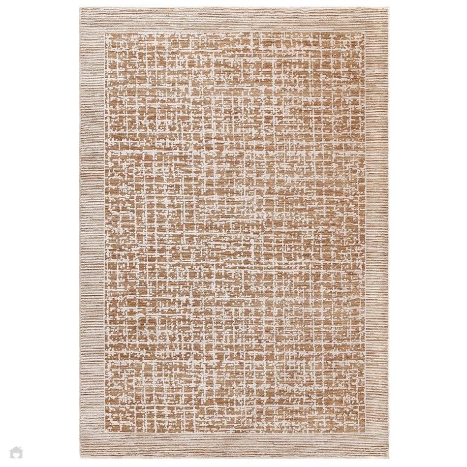 This rug features a soothing blend of Warm Beige Tan, Creamy White, and Golden Tan, presented in a softly abstract, distressed pattern with a raised texture that adds dimension. The structured linear border in Light Mocha enhances the design with definition and balance. Its neutral palette and subtle shimmer effect make it a stylish choice for modern, Scandi, and minimalist interiors alike.