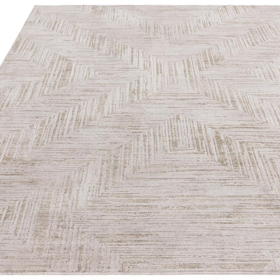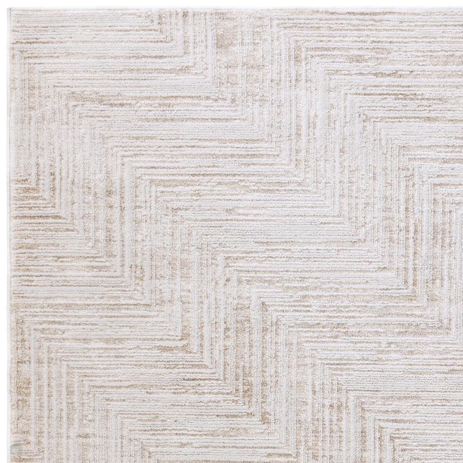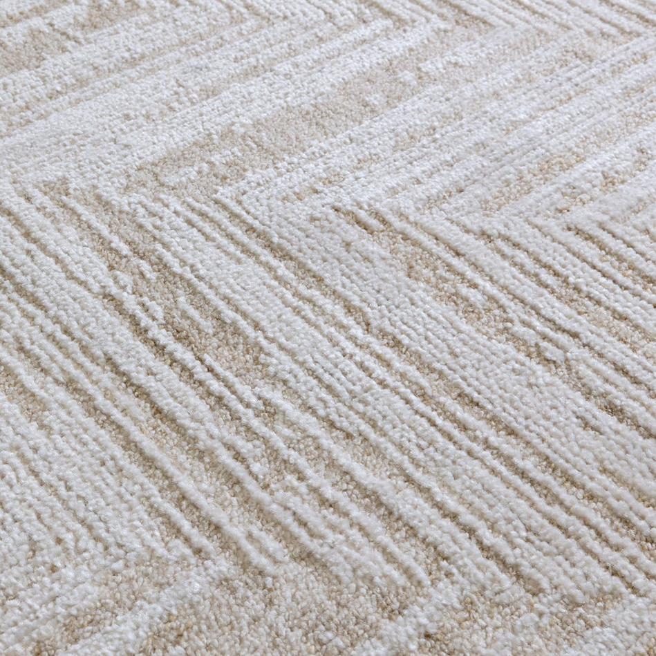 This rug showcases a soothing palette of cream, beige, taupe, and ivory tones arranged in a modern angular chevron design. The raised and recessed pile textures work together to create a dimensional effect, while the neutral shades ensure versatility. Ideal for calming, contemporary interiors, this piece adds depth and refinement without overwhelming a space.