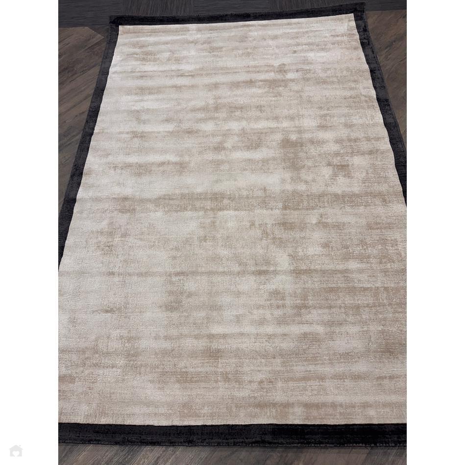 The Blade Slim Border Putty/Charcoal Border Rug layers Putty Beige, Stone Beige, Ivory, and Taupe within a shimmering centre, framed by bold Charcoal Grey and Shadowed Mocha. Crafted from 100% viscose with a tip-sheared finish and a 7mm flatweave pile, it offers a sleek profile with a silky-soft touch. The light-responsive sheen creates dynamic tonal shifts, making this rug a statement of refined elegance suitable for both modern and classic décor.