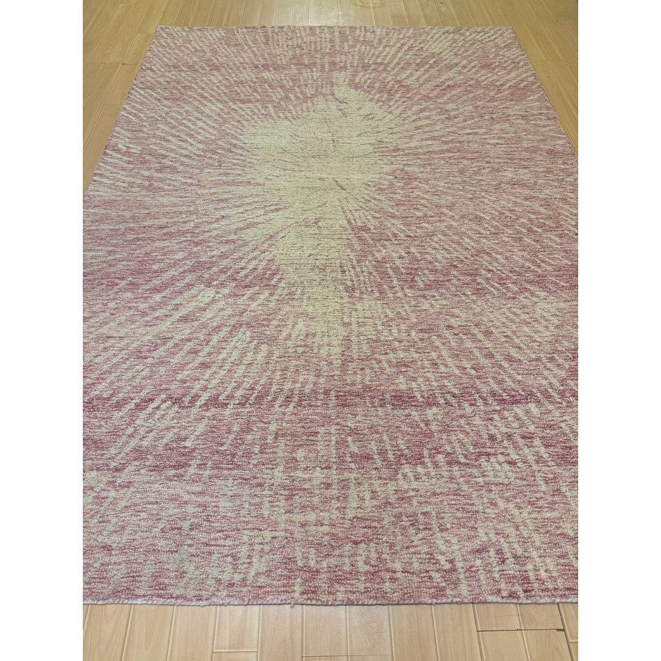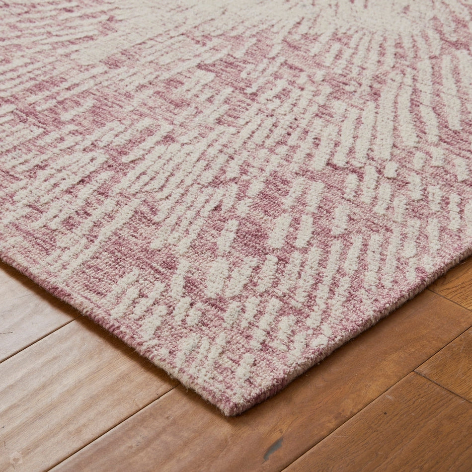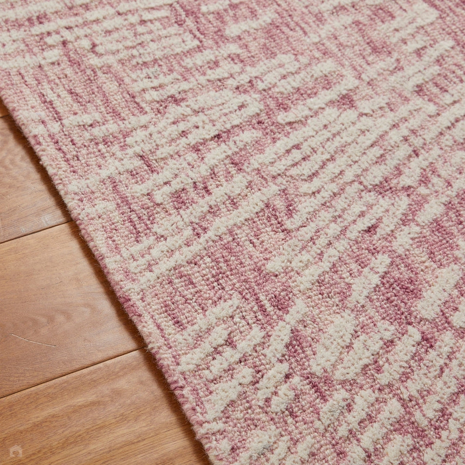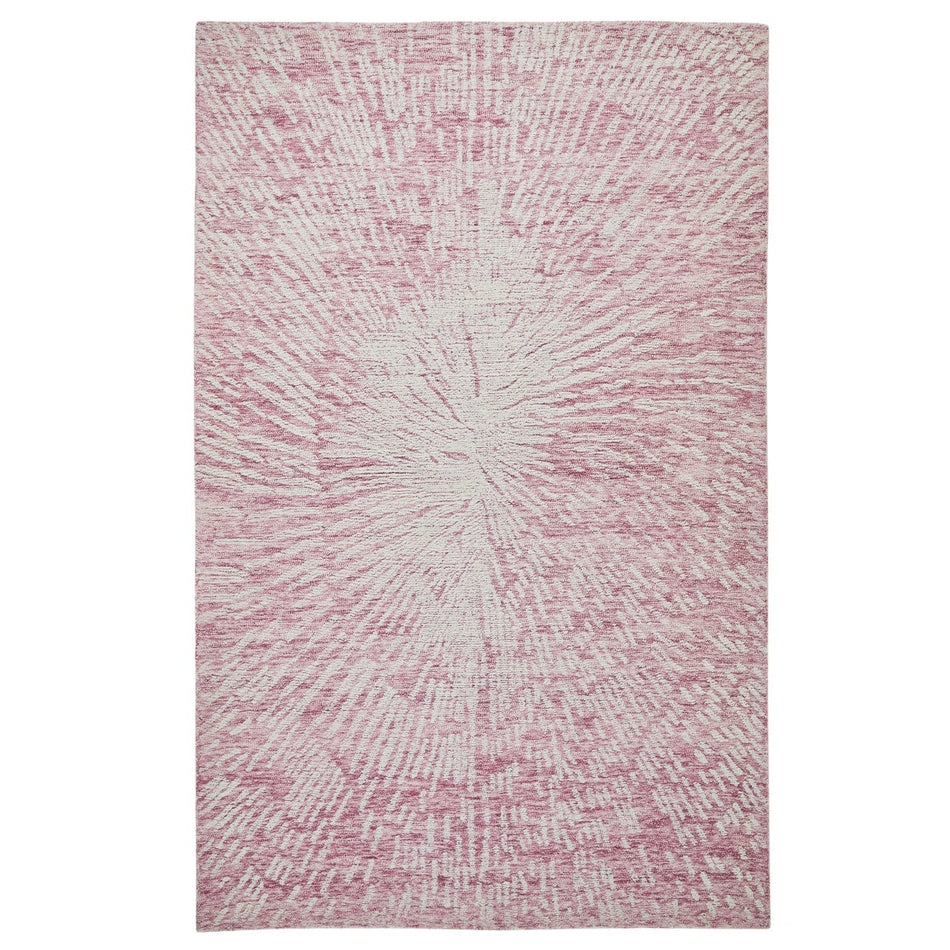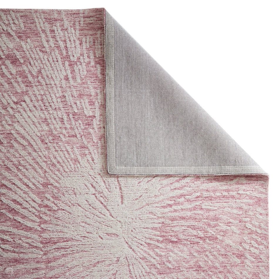 This hand-woven, textured wool loop pile rug features a dynamic burst pattern, with soft blush pink and dusty rose tones creating a delicate and sophisticated look. The ivory burst design contrasts beautifully, while warm beige undertones and muted coral highlights add depth and richness. The textured wool finish enhances the tactile appeal, making this rug a perfect choice for contemporary, modern, or elegant interiors.