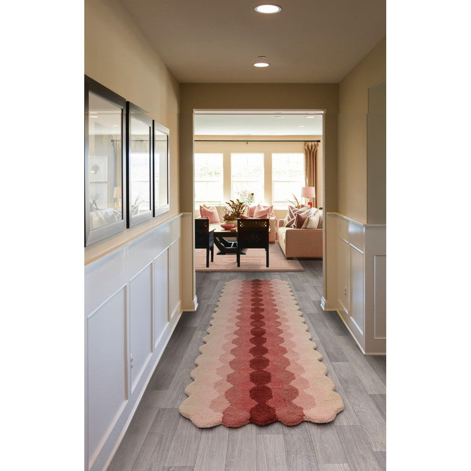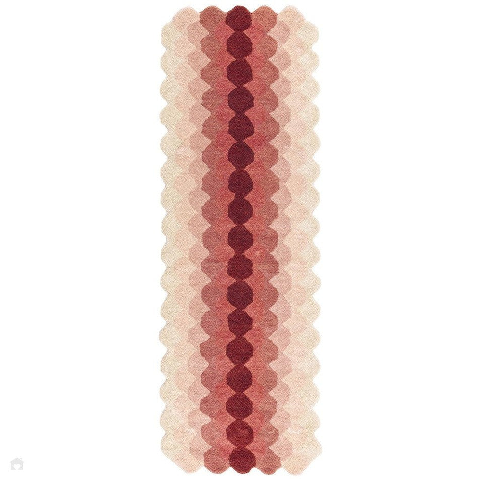 The Hive Pink & Burgundy Rug blends Deep Burgundy, Rosewood Red, Blush Pink, Dusty Rose, Powder Pink, and Cream into a striking hexagonal gradient design that flows seamlessly from dark to light. Hand-tufted in India from 100% pure wool, this rug offers a luxuriously soft feel with an 8mm low-profile short pile that is practical yet stylish. The scalloped edges enhance the contemporary appeal, making it perfect for bedrooms, living rooms, and romantic or modern interiors where soft, warm tones create a cosy, inviting atmosphere. Its rich gradient effect brings depth, movement, and a touch of sophistication to any space.