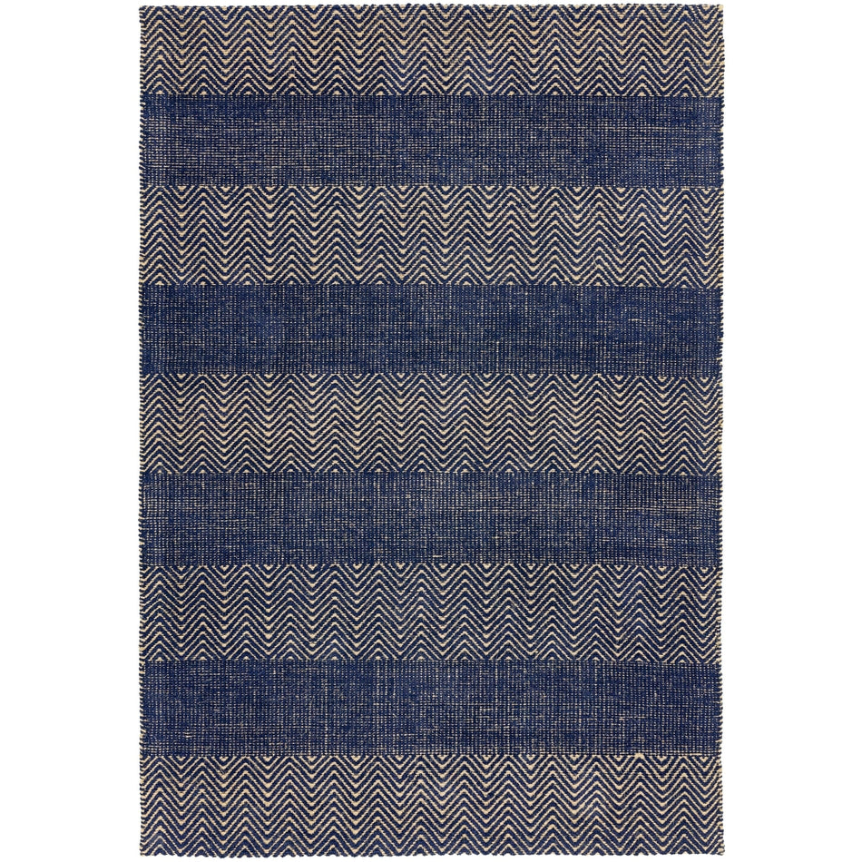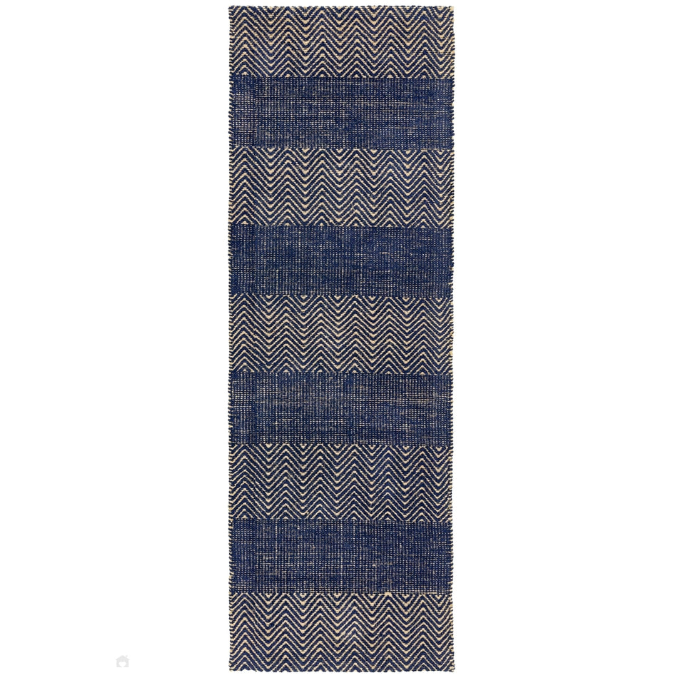 The Ives Modern Chevron Stripe Navy/Beige Runner combines artisanal craftsmanship with bold modern design, creating a sophisticated statement piece for any home. Hand-woven in India from a durable blend of 60% cotton chenille and 40% jute, this flatweave rug showcases alternating stripes of chevron and textured linear bands. The mix of natural jute fibres and soft cotton chenille creates a beautifully tactile surface, while the deep navy tone adds rich contrast and a sense of modern elegance to living spaces, dining rooms, or hallways.