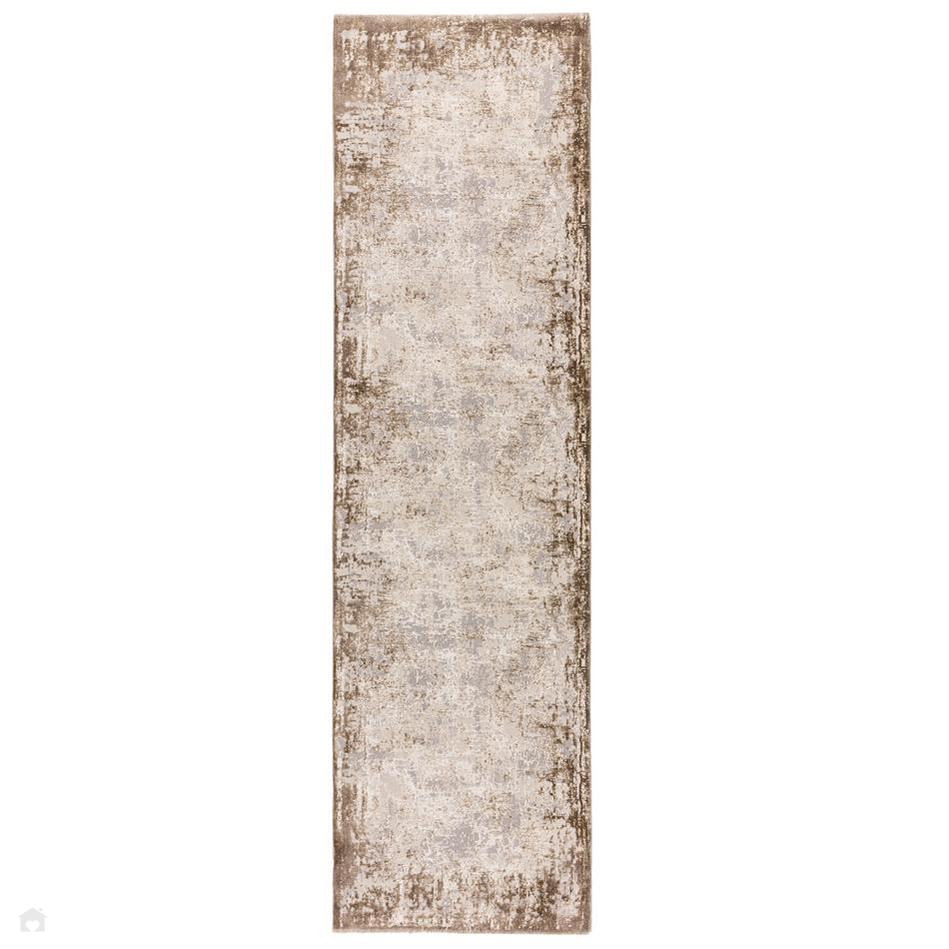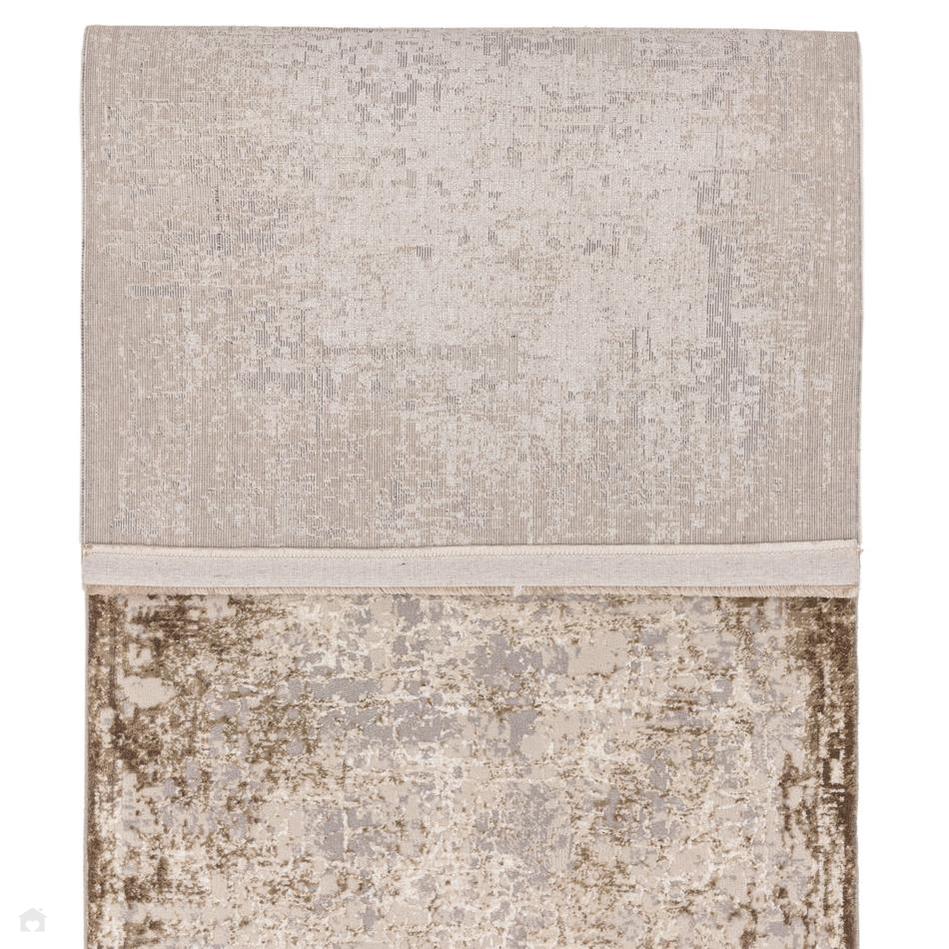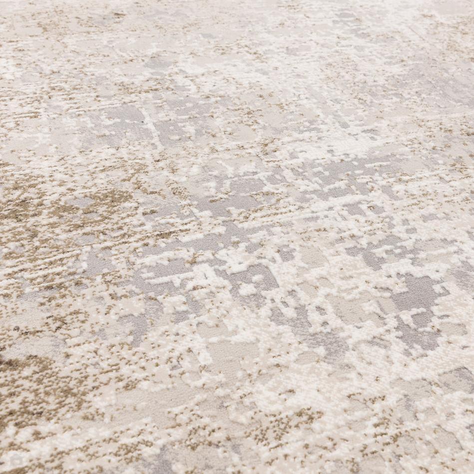 The Kuza Border Modern Distressed Rug in Beige, Light Grey, and Cream features a velvety soft, high-density hi-lo textured short pile with a subtle shimmer that beautifully highlights its abstract design. With a 1.1 cm pile height, this rug provides a plush underfoot feel while remaining durable and practical for everyday use.